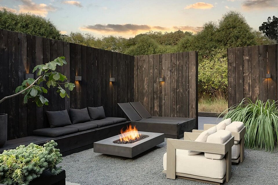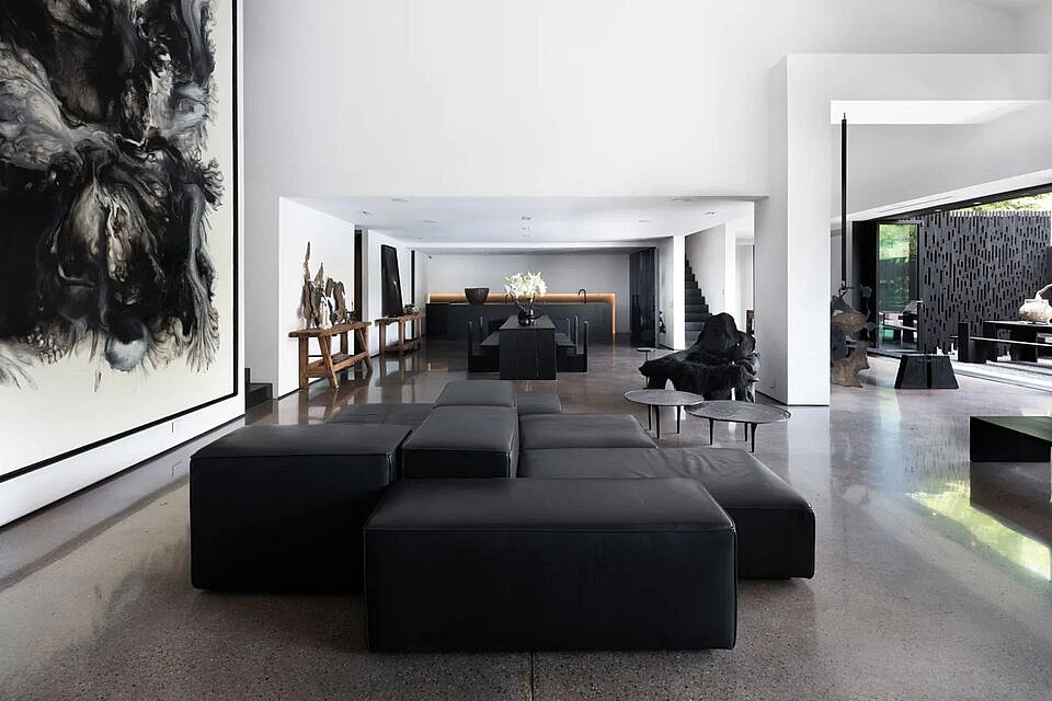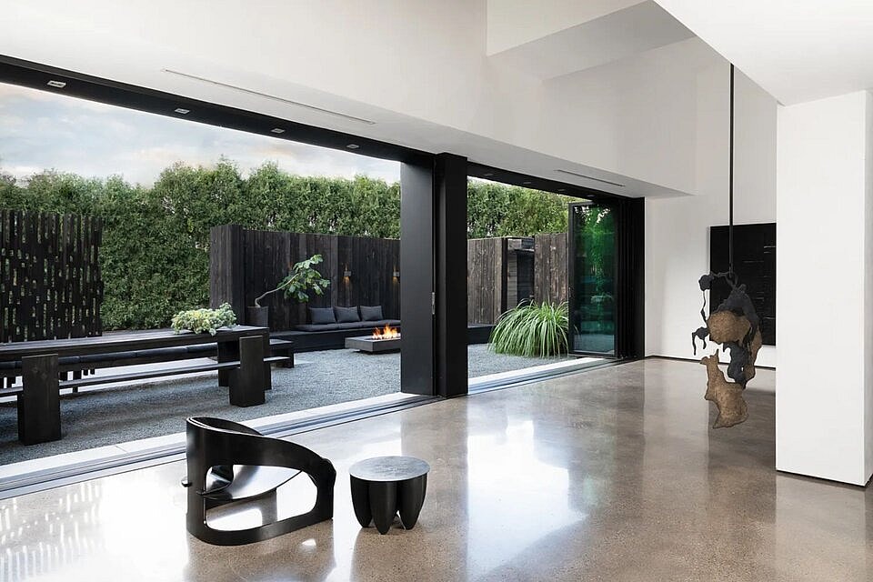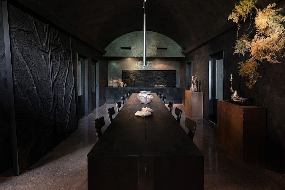 The listing is a “bow-truss industrial warehouse rehabbed into a work of art,” Christie’s notes, complete with plenty of blacked-out, luxe interior finishings and design detailing. It includes a bit of everything, from an artist studio to an open floor plan across its 7,400-square foot space. 40-foot glass doors open onto an impressive backyard, complete with built-in seating and a custom, handsome fire pit (in black, naturally).