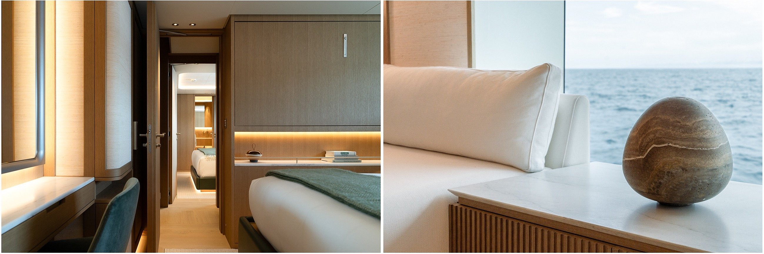 Throughout the luxe property-meets-sailing vessel, Meyer Davis notes Scandinavian design touches “add a sense of warmth through sophisticated wooden materials, inviting hues, and earthy tones.” A series of spaces, including a dining room, living room and suite-like rooms themselves were centered around being “both welcoming and sophisticated while being enjoyed,” the company said.