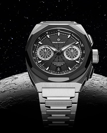The small seconds counter chronograph at 9-o’clock features a hand shaped like NASA’s Saturn V rocket.