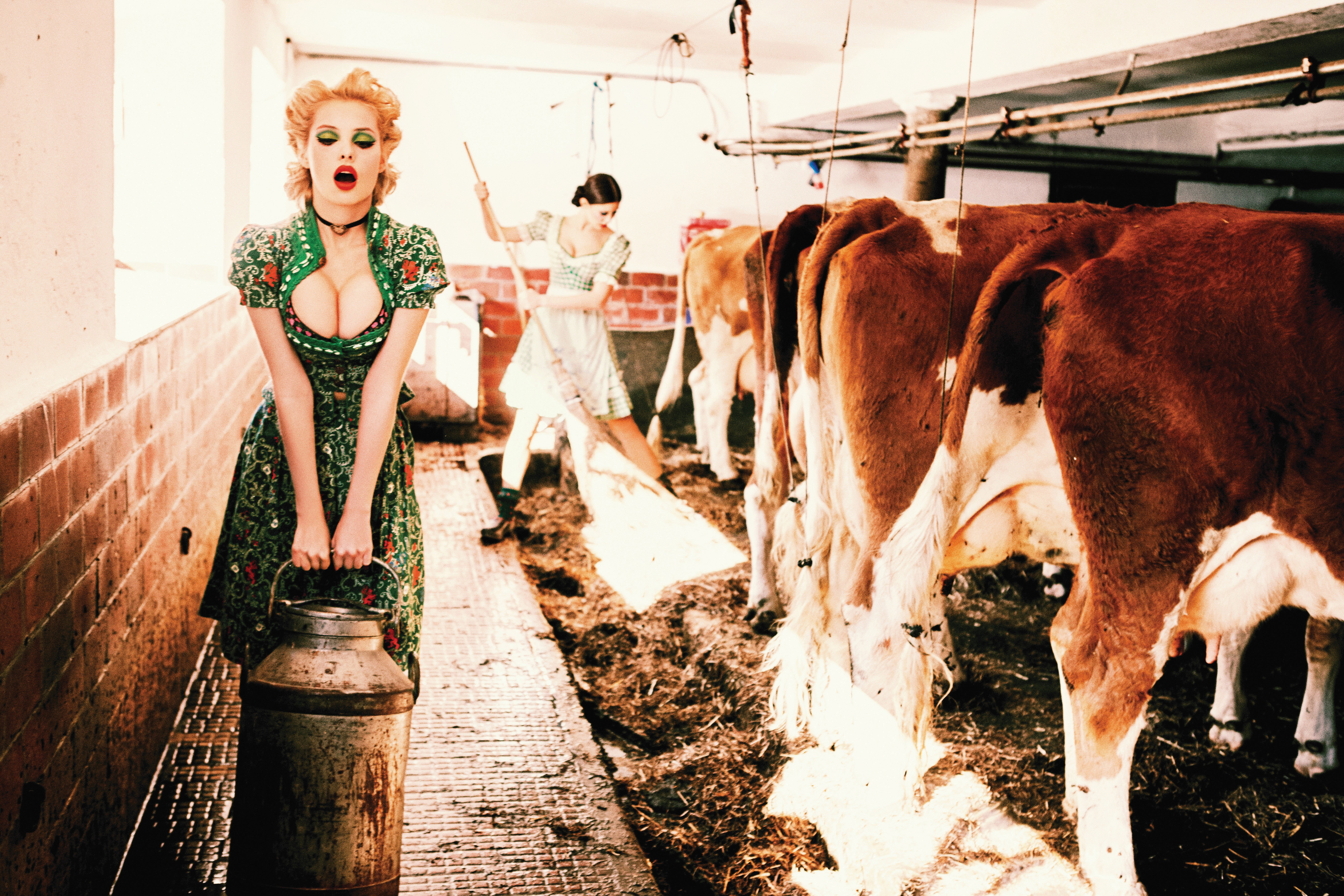 They may merely be milking cows, chopping wood, cooking dinner, baking bread, fishing, hunting, sledding or pouring beer, but von Unwerth’s not-so-wholesome maidens are obviously enjoying themselves to the hilt, and even the most mundane subjects are given epic visual treatment. As she told the Luxury London site, “A photograph doesn’t need to [simply] be beautiful. Because otherwise, it’s just pretty—and you just click through or turn the page. It should be provocative. It should evoke things. It should reveal a certain beauty that one might not see initially.”