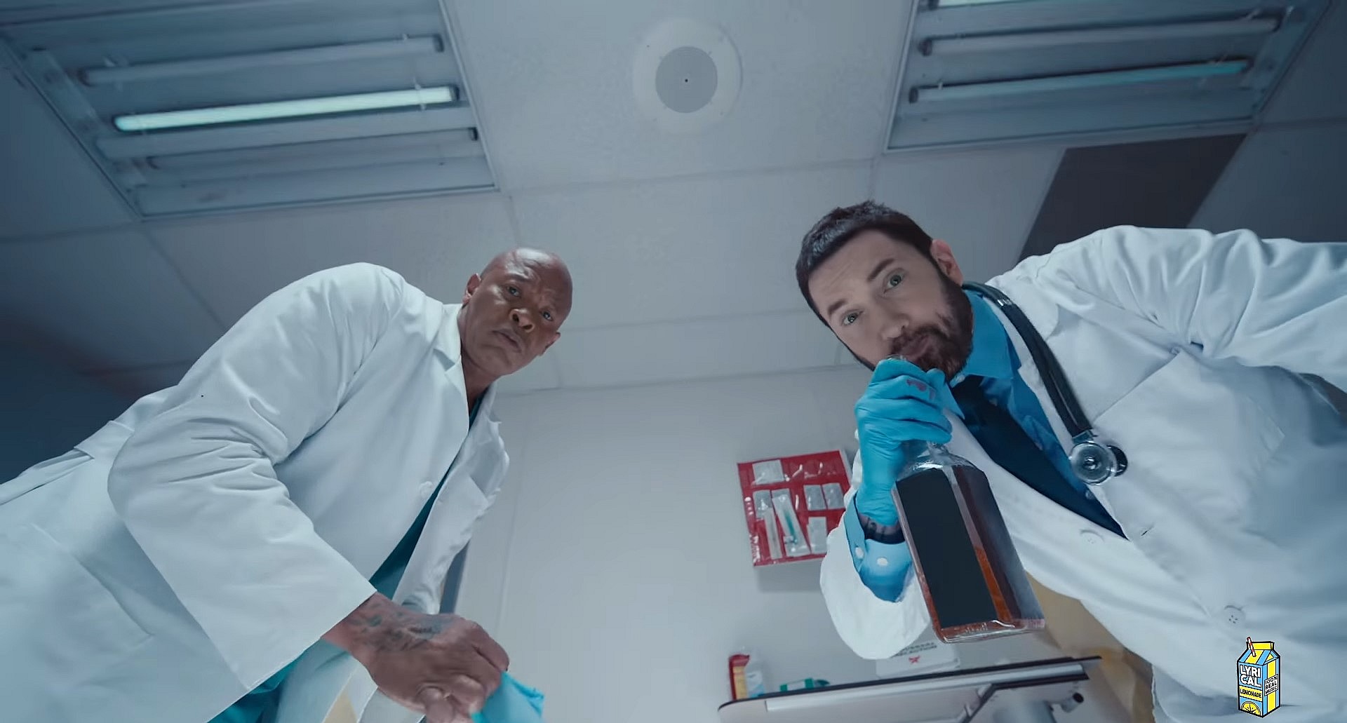 The Cole Bennett-directed clip begins with Em in a warehouse, where he imbibes “Godzilla” whiskey and encounters some surreal hallucinations. Eminem is depicted blasting a bandit with a rocket-propelled grenade, vomiting Legos, literally spitting fire, and ascending a stack of his old CDs before Tyson knocks him out. Then we see Em in a hospital bed, where he’s tended to by Dr. Dre and Tyson.