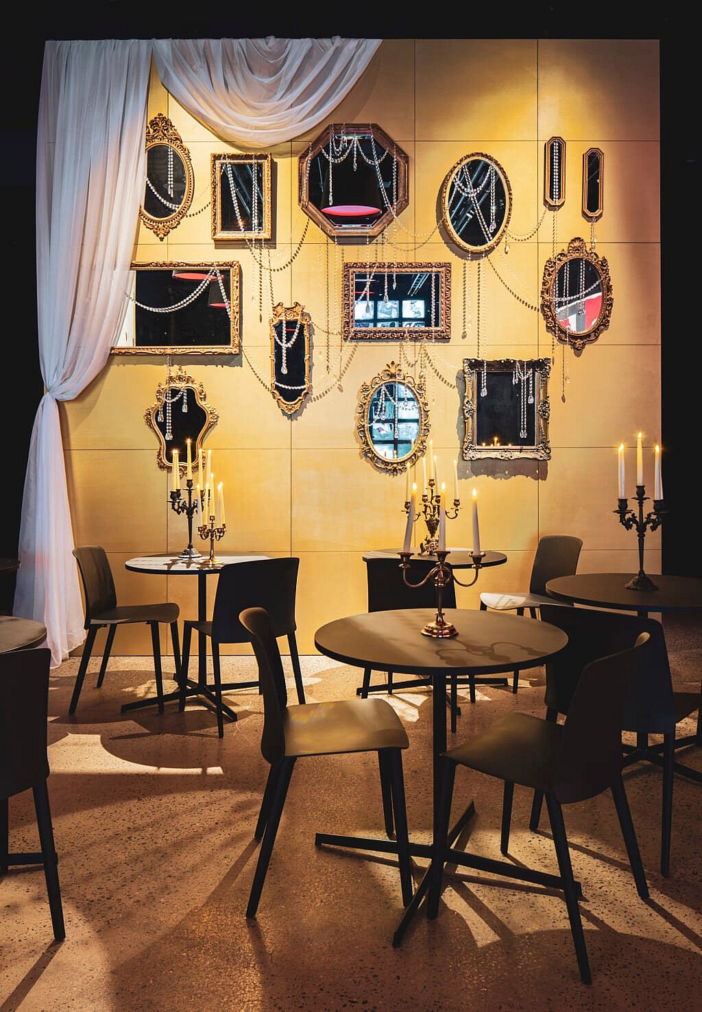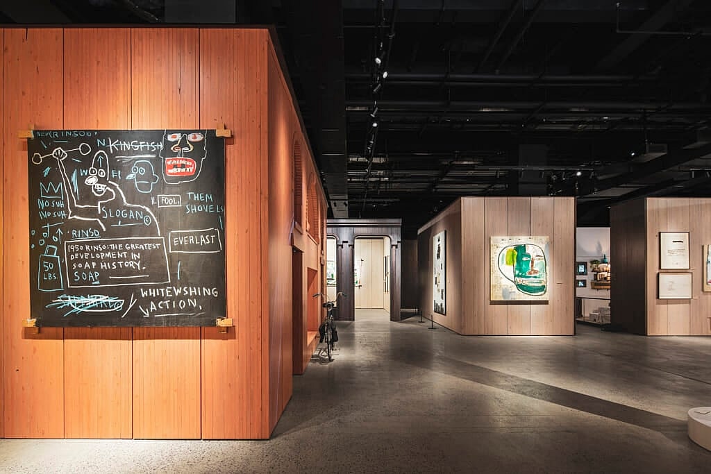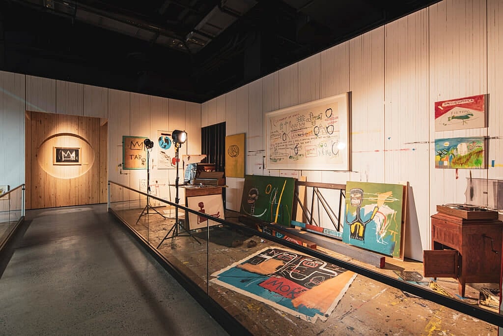 Before hitting the King Pleasure Emporium, a chic gift shop also curated entirely by the artist’s family, viewers step into a full-scale rendition of the long-gone Palladium night club’s VIP area, the Michael Todd Room, where Basquiat partied and installed commissioned paintings.