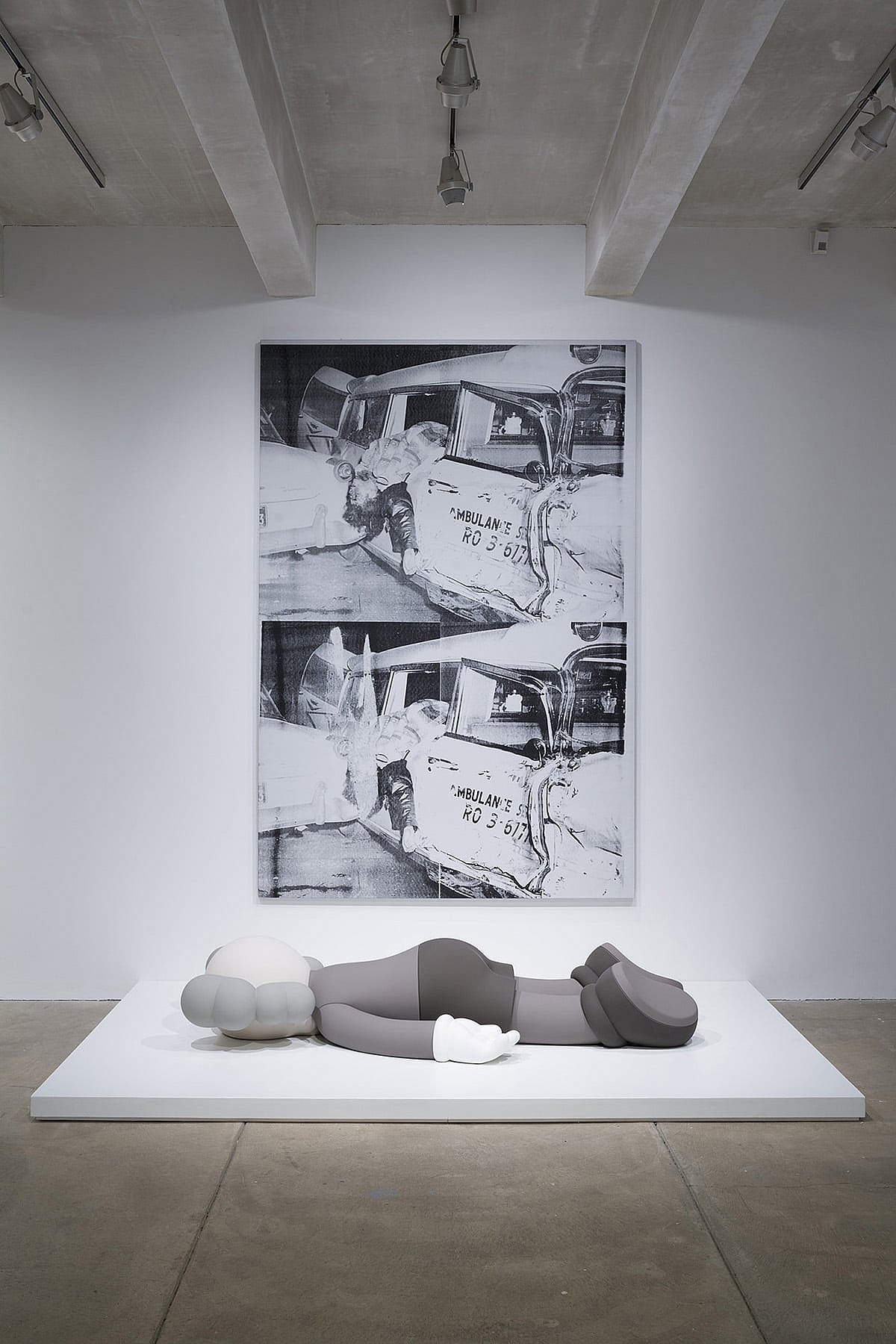 The central spectacle anchoring the exhibition, however, situates a 2020 edition of KAWS’ iconic “COMPANION” character prone before Warhol’s diptych “Ambulance Disaster” (1963-64)—a silkscreen depicting what it says, in morbid detail. Electric chairs and more car wrecks appear later across the sections “Nostalgia,” “Anxiety,” “Abstraction,” and “Advertising.”
