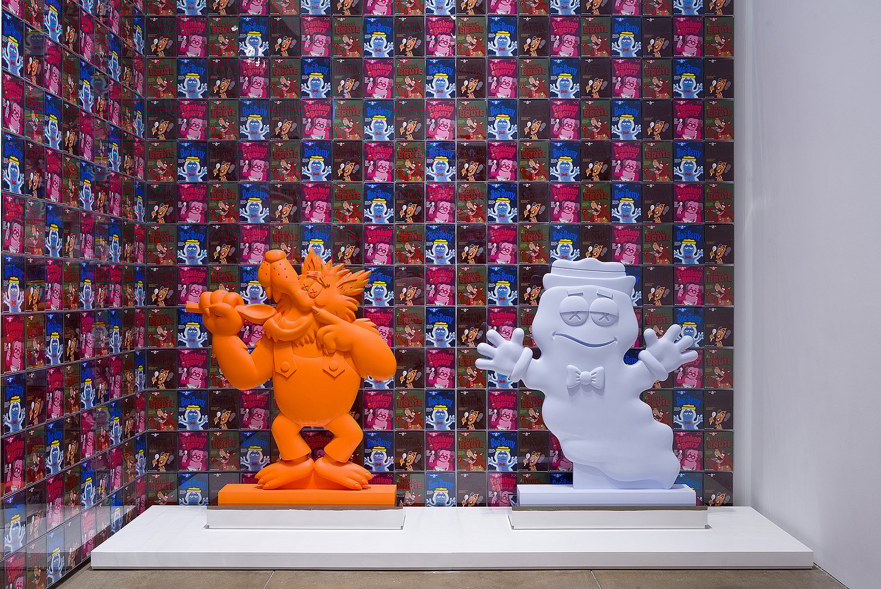 As a counterweight, the show’s lighter second floor highlights “Commerce And Play.” Warhol’s Brillo boxes from the 1960s beckon guests into a cereal installation that KAWS staged by paneling a gallery with thousands of (full) cereal boxes from his recent work with General Mills.