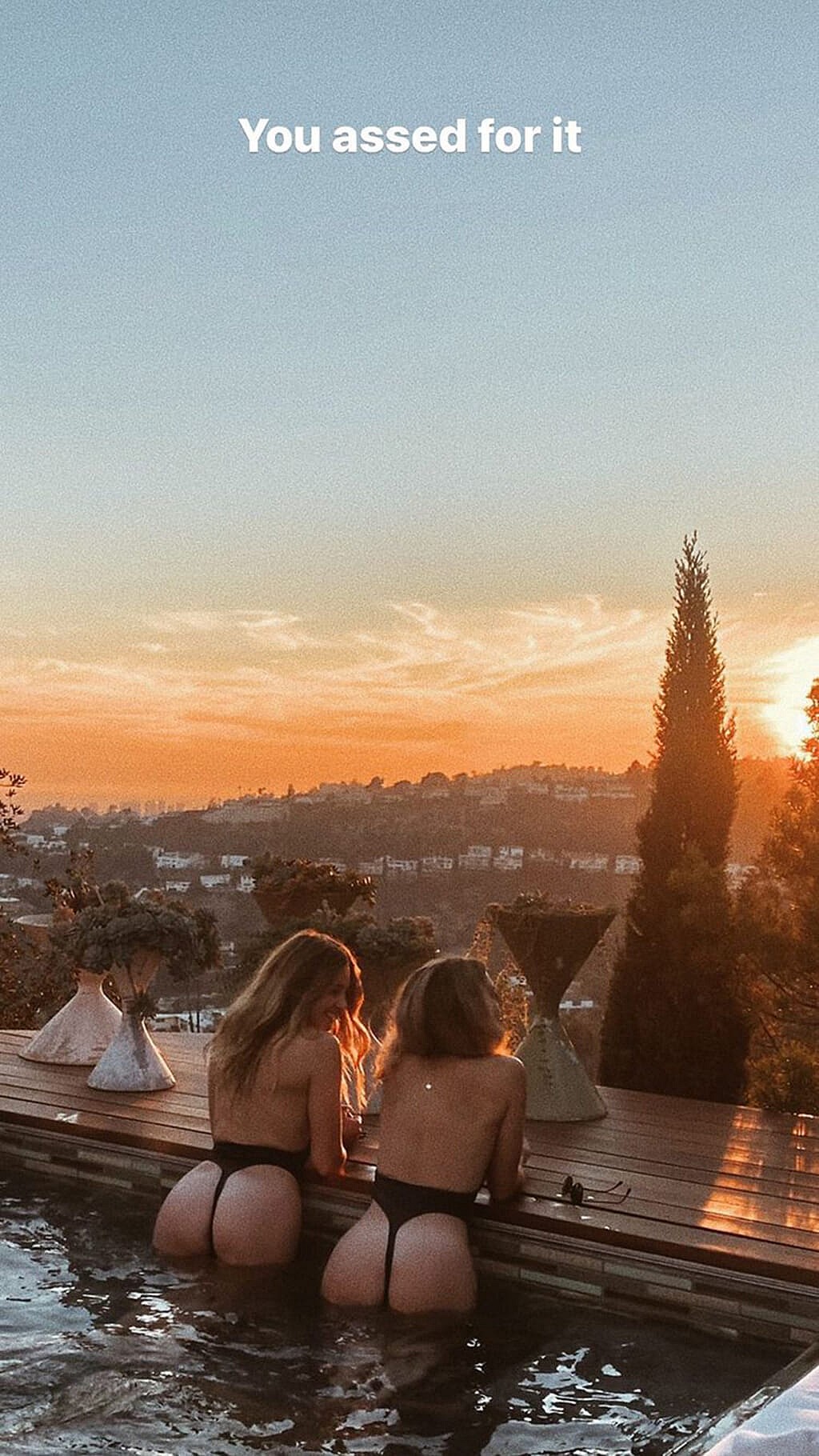 The English model, who’s been linked to Ted Lasso star Jason Sudeikis, flaunted her bum alongside a friend while basking in an LA sunset in an Instagram Story photo preserved by the New York Post.