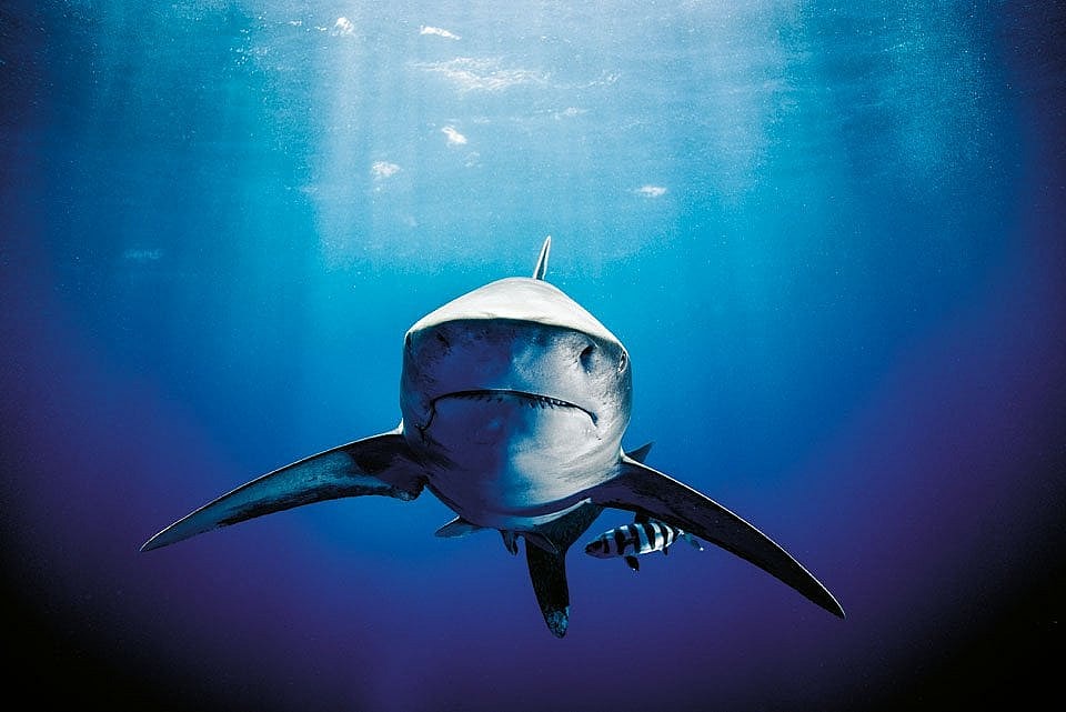 Treating the toothy monsters like the Hollywood hotshots, Muller used a patented seven-bulb, 1200-watt plexiglass-encased strobe lighting rig, developed with NASA engineering, to capture his snaps – and no sissy shark cage, either. Included among the images is the first-known photograph of a great white breaching at night.