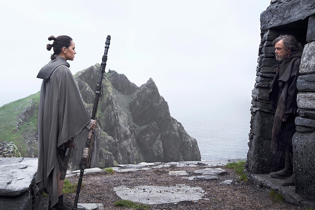 One shows Rey, portrayed by actress Daisy Ridley, at the ruins of the first Jedi temple. Another shows her approaching none other than the O.G. Jedi Master, Luke Skywalker, who appears disheveled and to be in hiding.