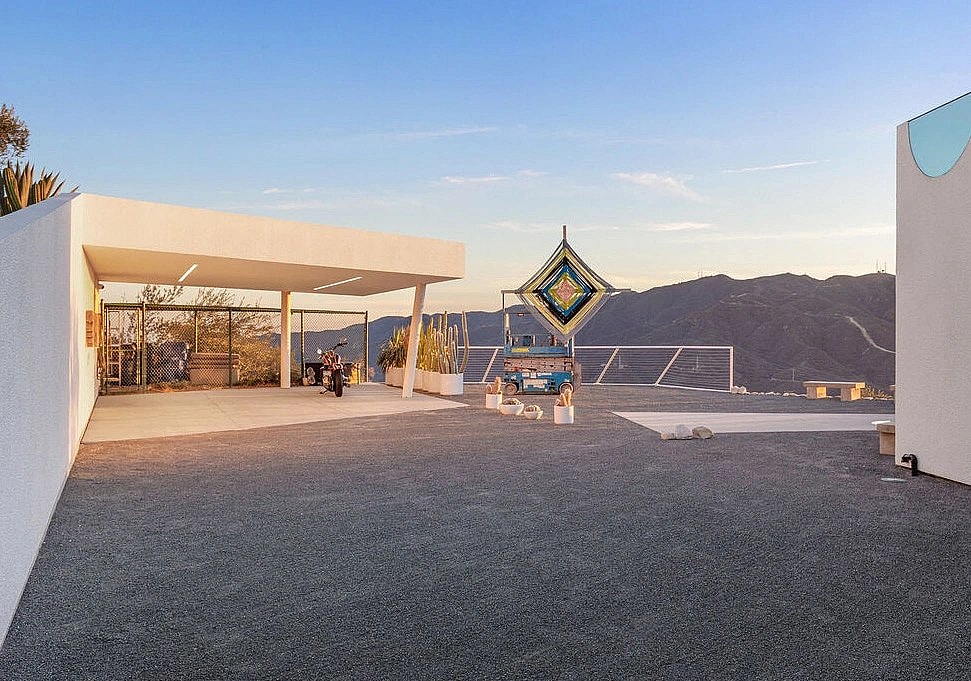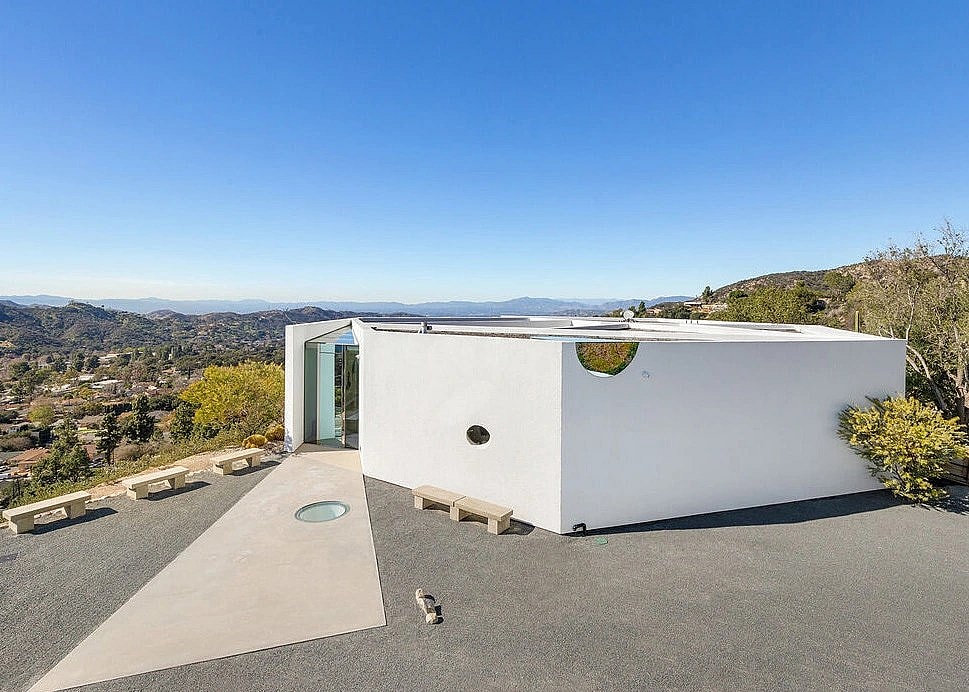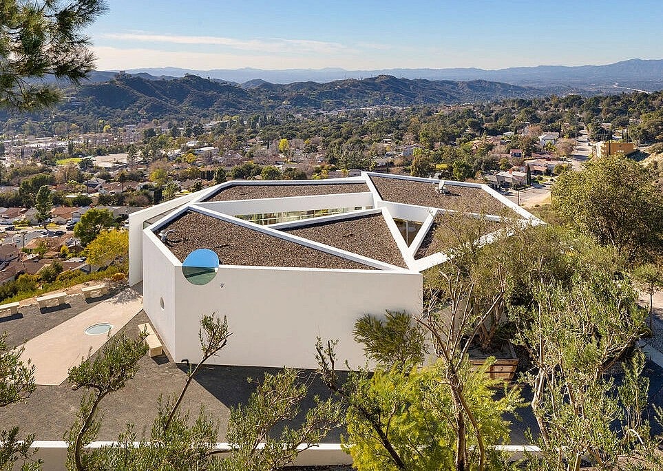 Of particular note on the property is a very impressive, seven-sided, uniquely spaceship-esque structure designed by Michael Maltzan, boasting a blue, curved-tile wall bathroom and at least one subterranean window.