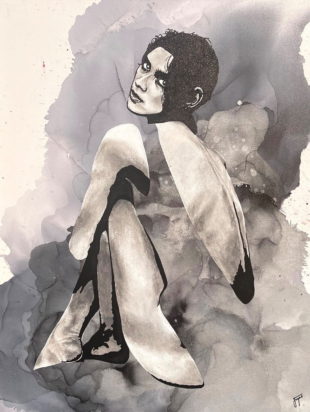 If euphoria had a human form, she’d look a lot like the woman Chicago-based artist Jenny Vyas has depicted in Acquit. A sensual female figure rocks backwards with hair in the wind and eyes closed, grasping on to what looks like a cross between an astronaut and crystal ball.