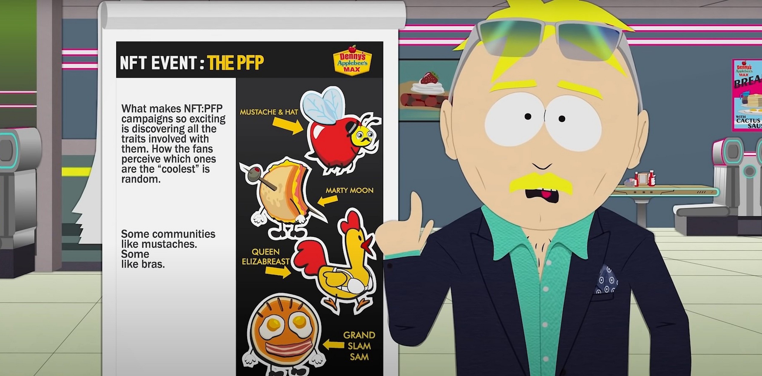 The closing of Butters’ pitch also pokes fun at the bandwagon-nature of NFTs’ massive rise in popularity.