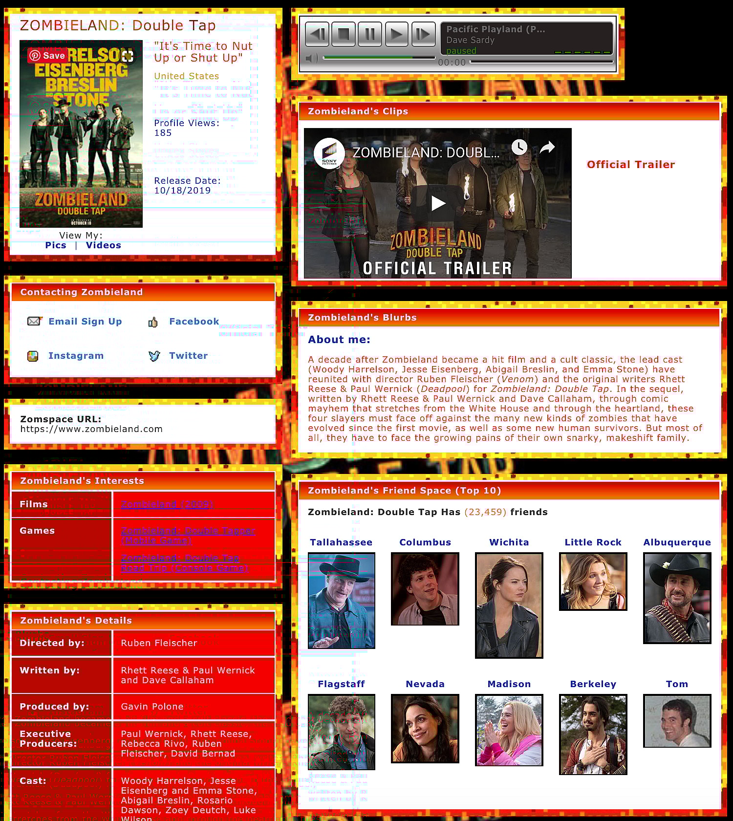 Zombieland Double Tap is coming out just over 10 years later, and in what must be a nod to the original’s debut during a somewhat different era social media-wise, Zombieland.com has become a retro Myspace profile page, complete with the Top Friends list and a goofy script that turns your mouse arrow into a “Z.”