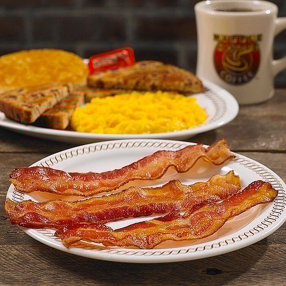 Over the course of one year, Waffle House serves over 25,000 miles of Smithfield bacon, enough to wrap around the equator. Stack all the sausage patties served annually and you’d create a meat tower four times as tall as the Empire State Building. And caffeine is very important here – eight Olympic swimming pools’ worth of coffee are served per year.
