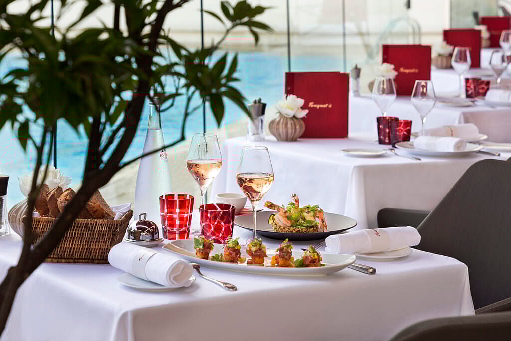 His food is deceptively simple, with extremely gourmet versions of burgers and fish and chips among the many standouts, along with grilled fish, loads of caviar, lobster salad, fresh oysters, and of course oceans of champagne, Veuve Clicquot brut and rosé being the top choices. You can’t go wrong with any dish or table at Foquet’s, which has views of both the pool and Le Majestic’s front entrance—just try not to get whiplash from craning your neck around to look at all the beautiful people.