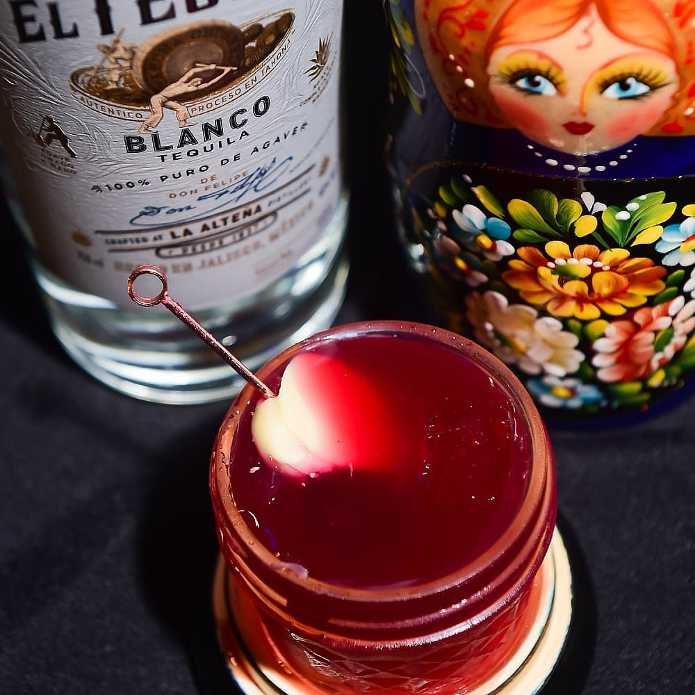 Sofia Valdez’s ”Juno and Avos” punch combined El Tesoro™ Blanco Tequila, Neversink Apple Brandy, Ancho Reyes Verde Chile Poblano Liquor, fresh beet juice, fresh lime juice and chamomile tea syrup.