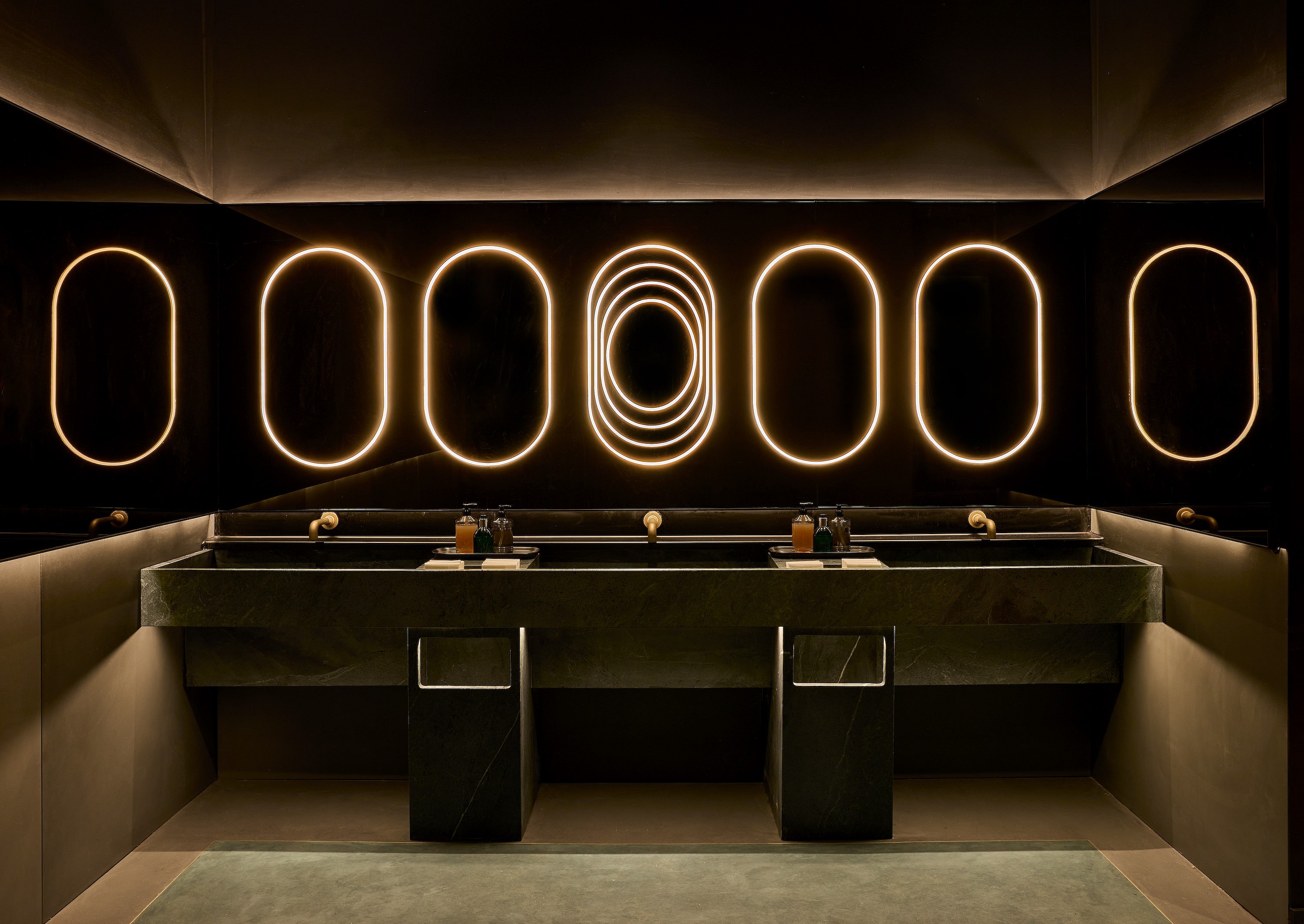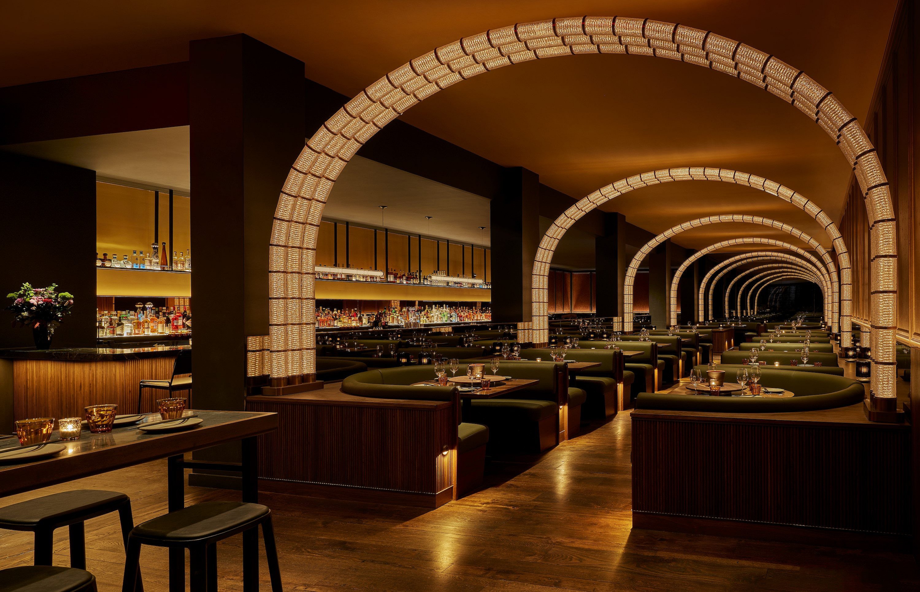 The moodily-lit eatery—designed by The Rockwell Group—features glass-and-bronze arches illuminating the dining room, forest-green banquettes, a glossy black soapstone and tambour wood bar, and an opulent hand washing station with glowing amber mirrors near the reception desk.