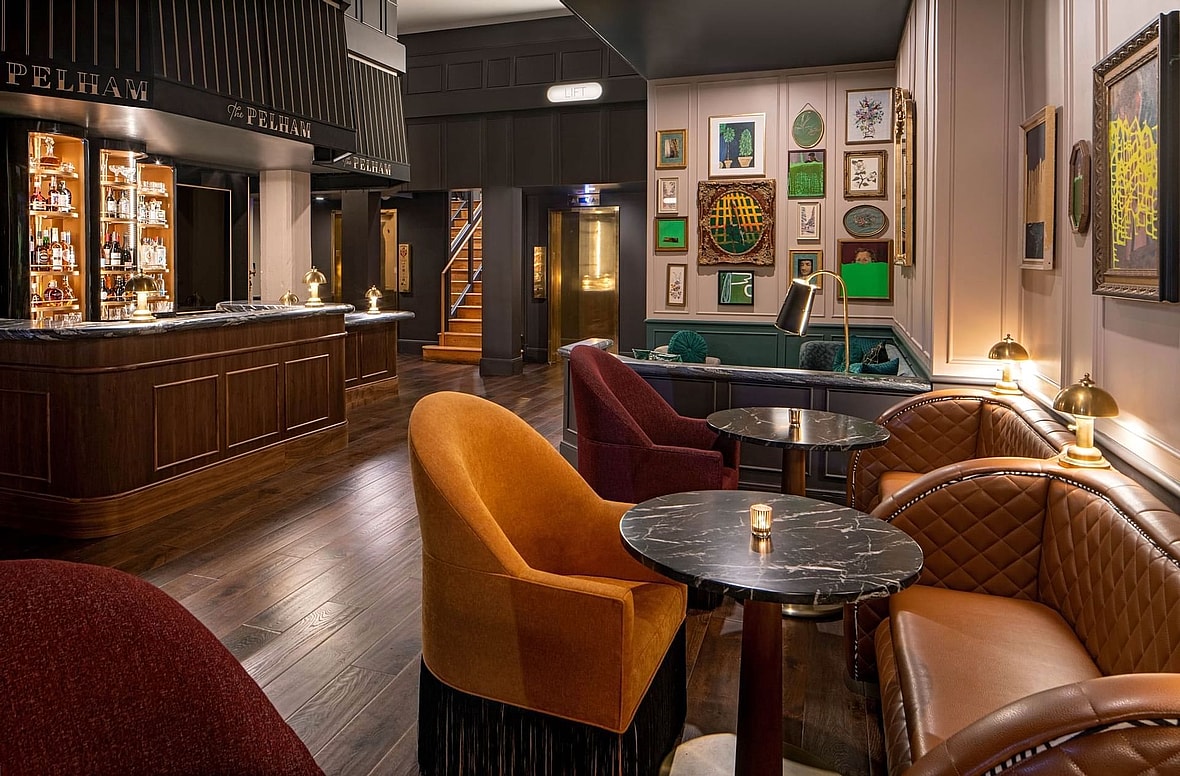Previously a rabbit warren of small spaces, The Pelham’s lobby has been transformed into a luxe lounge with gilded shelves filled with “hand-selected craft liquors, wines and treats reminiscent of the refined-and-eclectic tastes of a savvy world-traveler’s personal bar.”