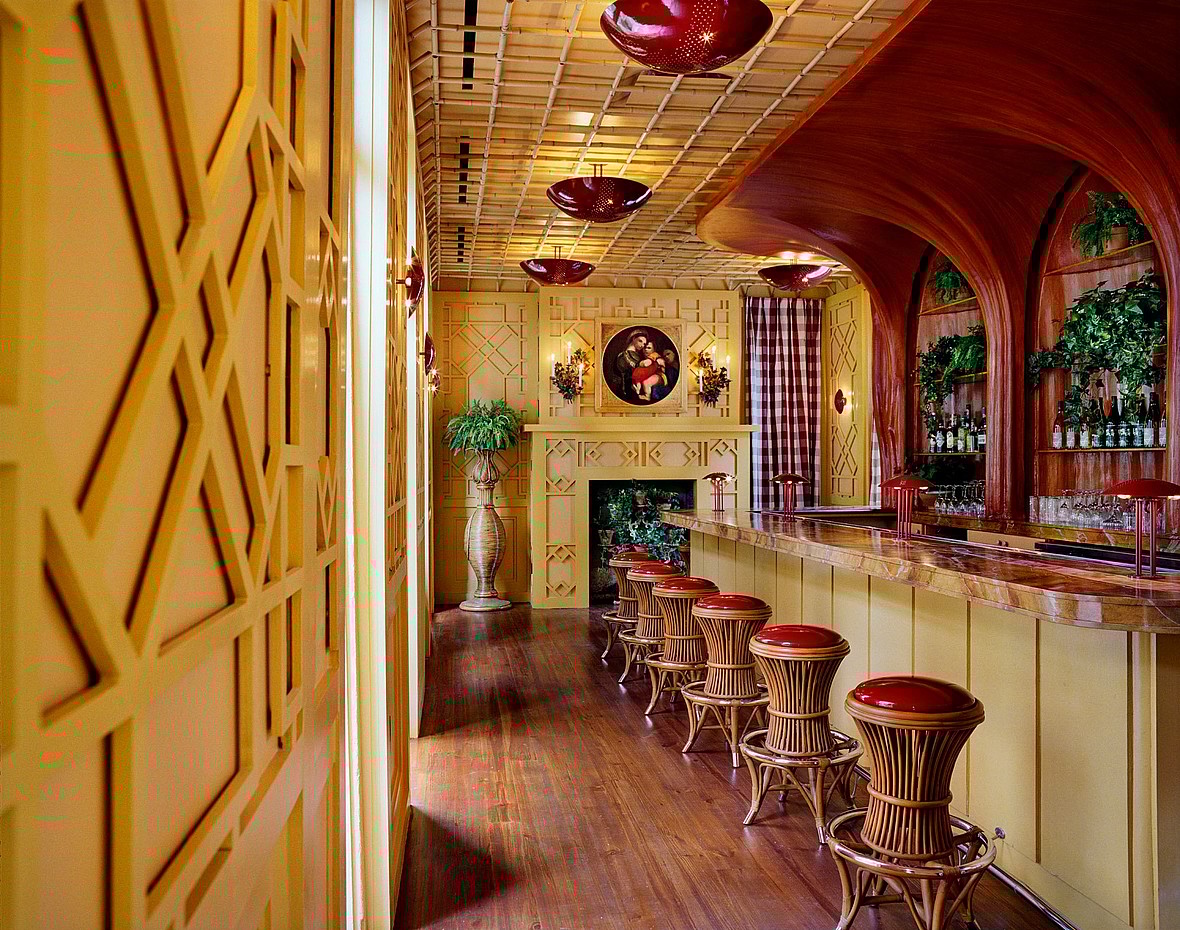 Wainscoting, windows, a marble bar counter and quilted leather banquettes complete the look, with oversized windows looking onto the street. A perfect place for a bourbon or two before heading out on the town.