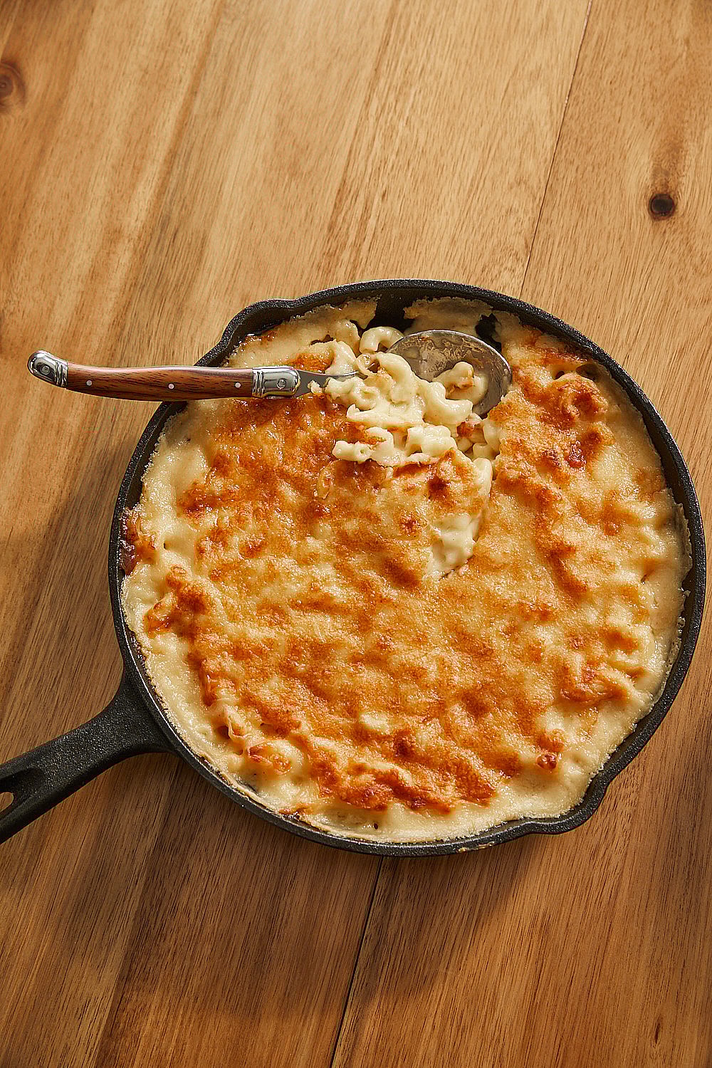 - Transfer mac and cheese to desired baking tray and top with mild white cheddar. Bake for 15-20 minutes at 350 degrees Fahrenheit or until cheese develops golden brown color.