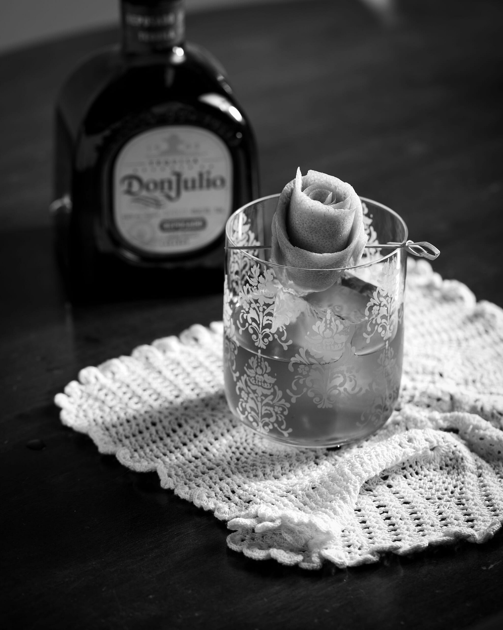Add all ingredients to a mixing glass and fill with ice. Stir cocktail until properly chilled. Stain over a large ice cube and garnish with grapefruit floret.