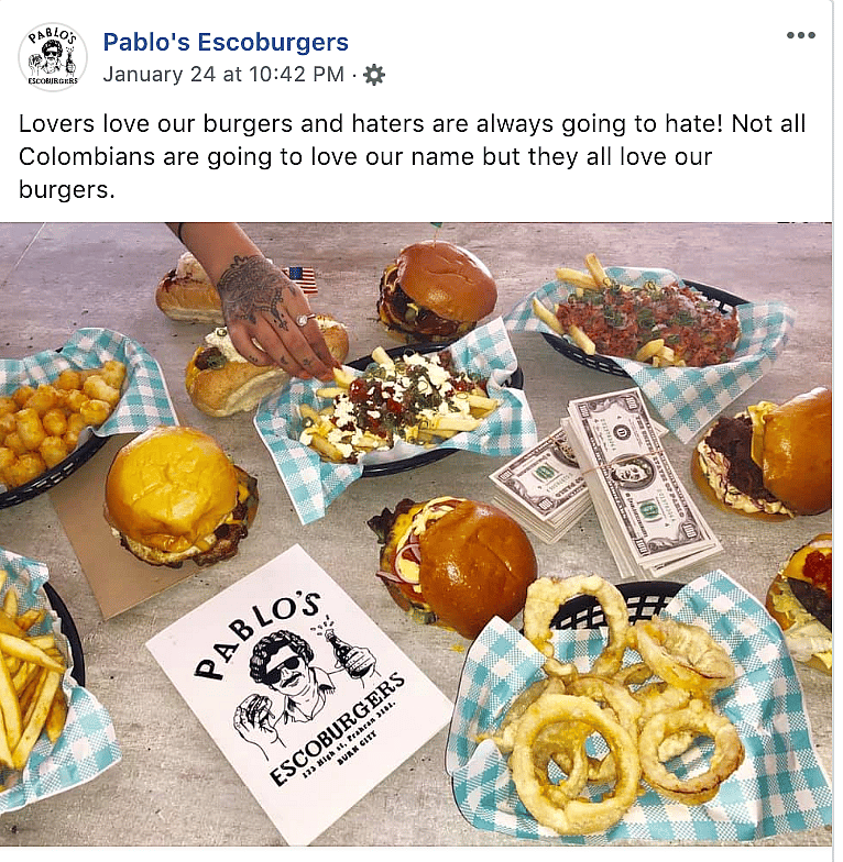 The restaurant’s co-owner Vaughn Marks went on to explain in a statement posted on Facebook titled “Not Here To Offend” that they “are very proud of our burgers but we do also understand that Pablo Escobar was a horrible man who destroyed the lives of thousands of Colombians.