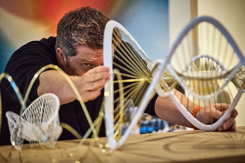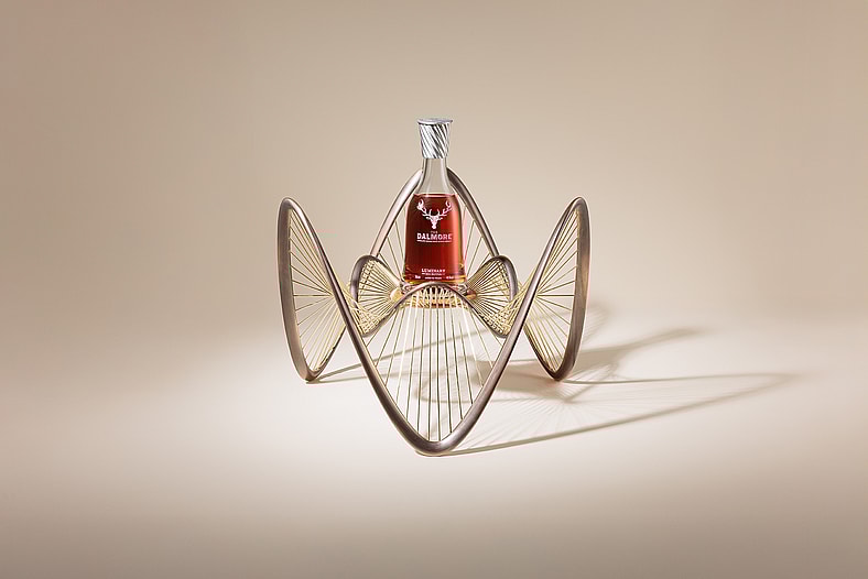 For his entry into the Luminary, Dobbin penned a bronze pedestal for his bottle that aims to be a physical manifestation of time itself. His sculpture’s elegant spoke-like rods draw in and lean out, creating both tension and balance, with the bottle appearing as if suspended in space. “So too was true for the whisky,” The Dalmore’s Master Distiller offers.
