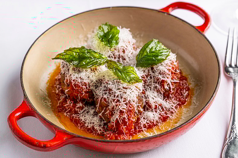 “For our meatballs, we use sweet Italian sausage instead of ground pork, which provides distinctly Italian-American umami,” said Carbone, a cofounder of Major Food Group. “We also use milk-soaked bread instead of breadcrumbs, which evokes a panada, the centuries-old European technique for making hearty boiled bread to infuse with all sorts of flavors, both savory and sweet. The meatballs are gently fried in olive oil and smothered in tomato sauce before being cooked low and slow to a precise internal temperature, just like a Sunday roast. We insist on mixing the blend by hand, gently folding the ingredients with the same delicacy required to make a soufflé, to achieve the tenderest result.”