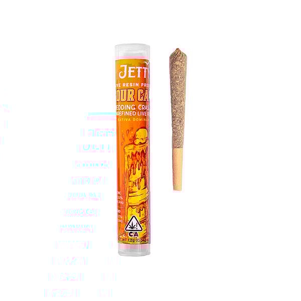 Cake on cake! Jetty’s Sour Cake is a new flower cross of Sour Diesel x Wedding Cake that’s a super-potent pairing with our Wedding Crasher UNREFINED Live Resin (Purple Punch x Wedding Cake). This dessert strain combo has heavy sweet and earthy notes — it packs a big punch (26% Sativa THC). Contains three prerolls. $27