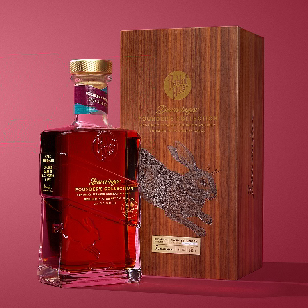 Boxed in wood with the signature rabbit engraved on magnetic front and back panels, only 2,444 sequentially-numbered bottles of Rabbit Hole “Dareringer” Founder’s Collection are being released with an SRP of $295.