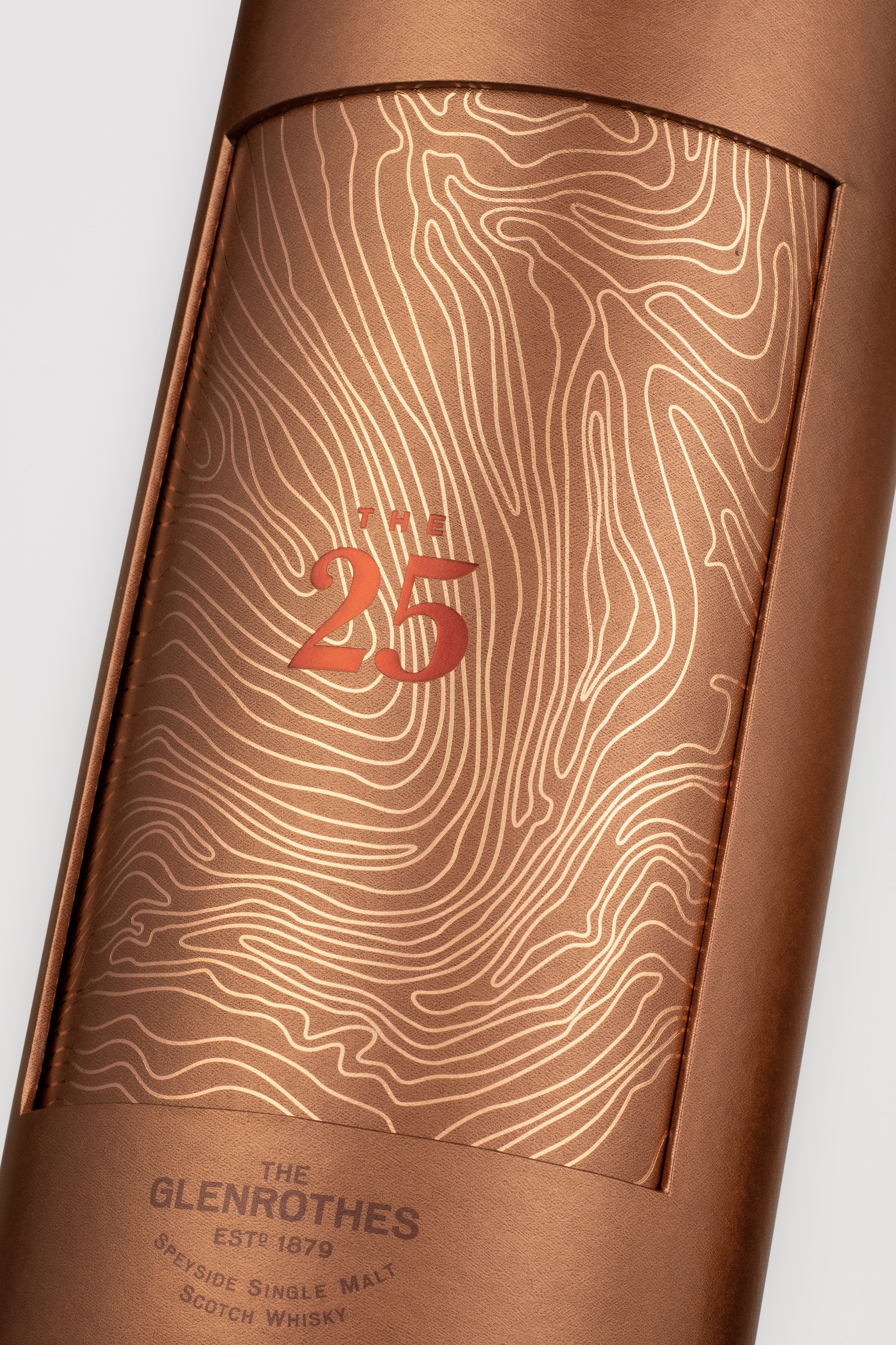 A fully recyclable, unfoldable cylinder holds the impressive liquid, rotating to reveal the latest from The Glenrothes, with a copper exterior (embossed with the topographic contours of the distillery) giving way to a textural verdigris inside.