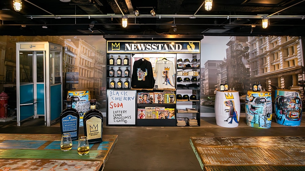 The tour turns the distillery’s impressive Barrel Tasting Room into another offshoot of Basquiat’s New York by displaying oversized Basquiat prints, decals and 1980s New York memorabilia.