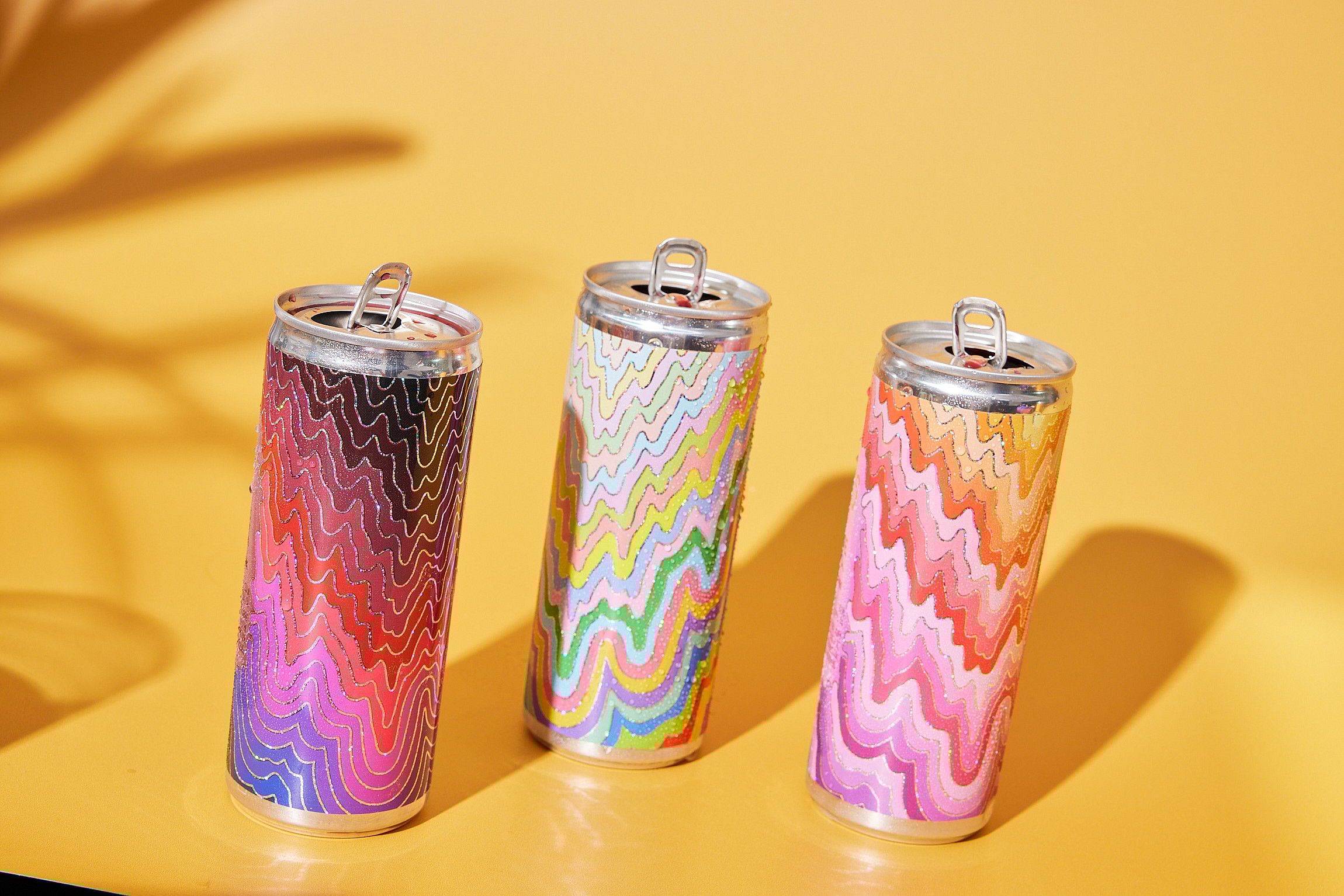 They’re also offering a new canned wine brand, WAVES, in collaboration with L.A.-based visual artist Jen Stark, that showcases their most mind-bending artwork yet, with Stark’s signature psychedelic renderings wrapped around sparkly aluminum cans.