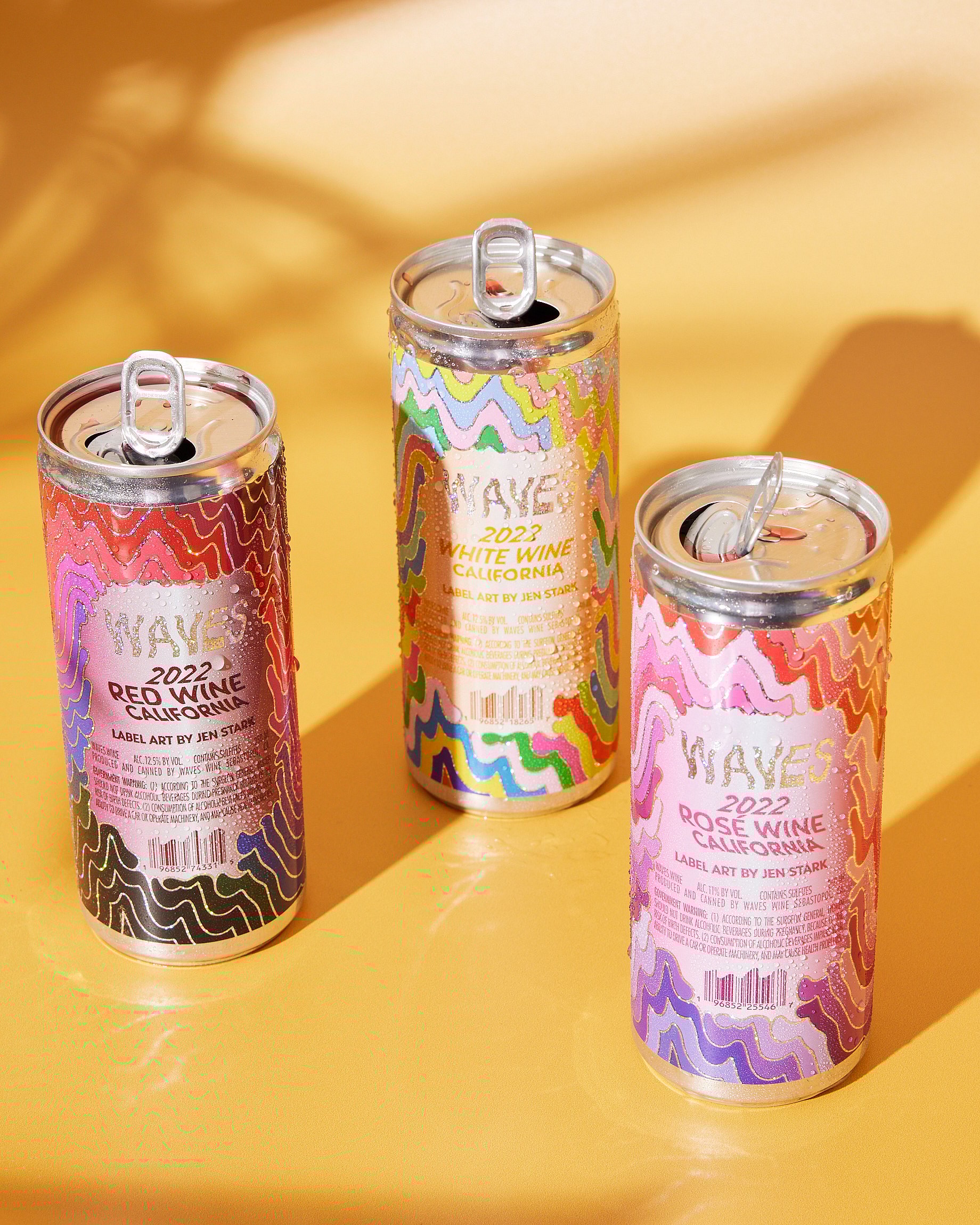 They’re also offering a new canned wine brand, WAVES, in collaboration with L.A.-based visual artist Jen Stark, that showcases their most mind-bending artwork yet, with Stark’s signature psychedelic renderings wrapped around sparkly aluminum cans.