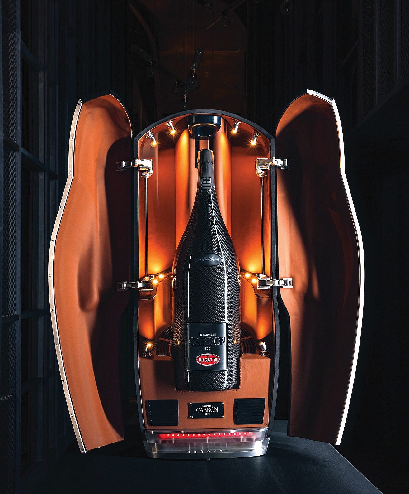 Their first collaboration was the launch of EB.01, made using only grapes fromthe most distinguished terroirs of Champagne from a 2002 vintage, an homage to Bugatti founder Ettore Bugatti. They subsequently presented a one-of-one vintage champagne in a custom carbon fiber-coated bottle and leather-lined case, dubbed La Bouteille Noire and inspired by their $16 million one-off hypercar, La Voiture Noire.