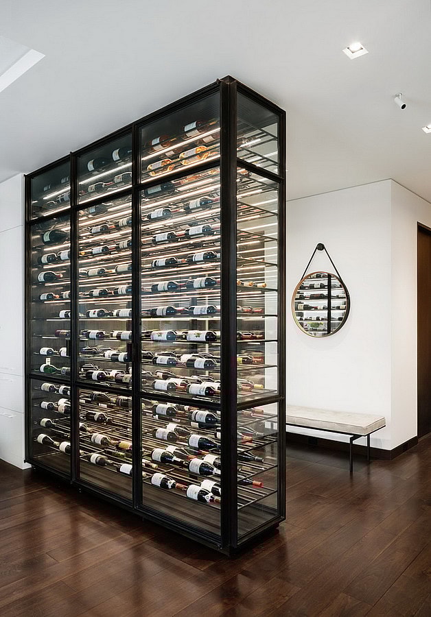 “A custom designed horizontal, blackened steel racking with recessed LED strip lights hold and illuminate the nearly 400 bottle collection, while custom offset pivot hinges allow for access to the wine storage from the kitchen side.