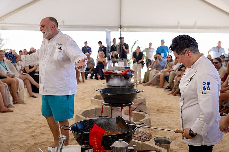 “When the lionfish see me, they all go!” Andrés bellows while detailing a recent fishing expedition in search of his favorite invasive delicacy. As his team prepares paella in several large pots, Andrés asserts his dish’s supremacy over risotto, then playfully grabs a front row attendee’s Marriott Bonvoy-branded personal electric fan to cool off as his crew hands out caviar-and-truffle-flecked omelettes and glasses of white strawberry sangria.