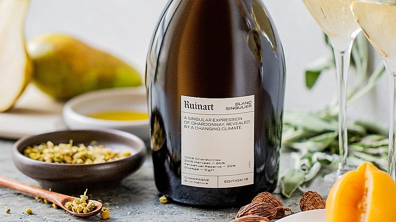 Increasingly hot temperatures have also thrown a serious wrench in Champagne production. Vintages are hotter and weather is more drastic, making it difficult to meticulously coax grapes to perfect ripeness. To safeguard against unpredictable vintages, Ruinart has shifted away from releasing vintage-dated Champagnes and focusing on a new cuvee called Blanc Singulier, which the house describes as a “nature-led cuvée that tells the story of a singular year as impacted by environmental factors.”