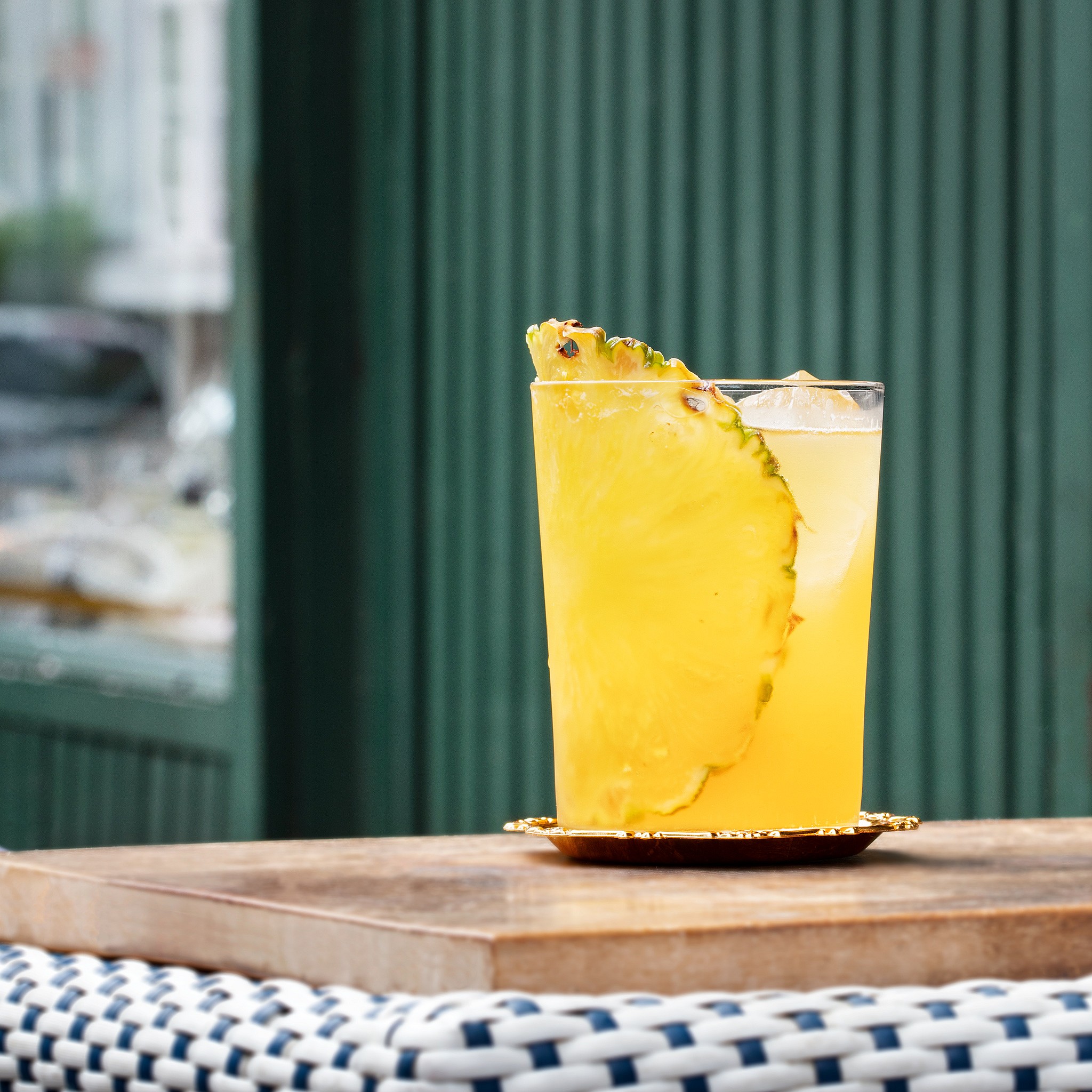 Build over ice in a Spritz Tumbler glass and stir well, top with East Austin pineapple cider and thin pineapple wheel for garnish.