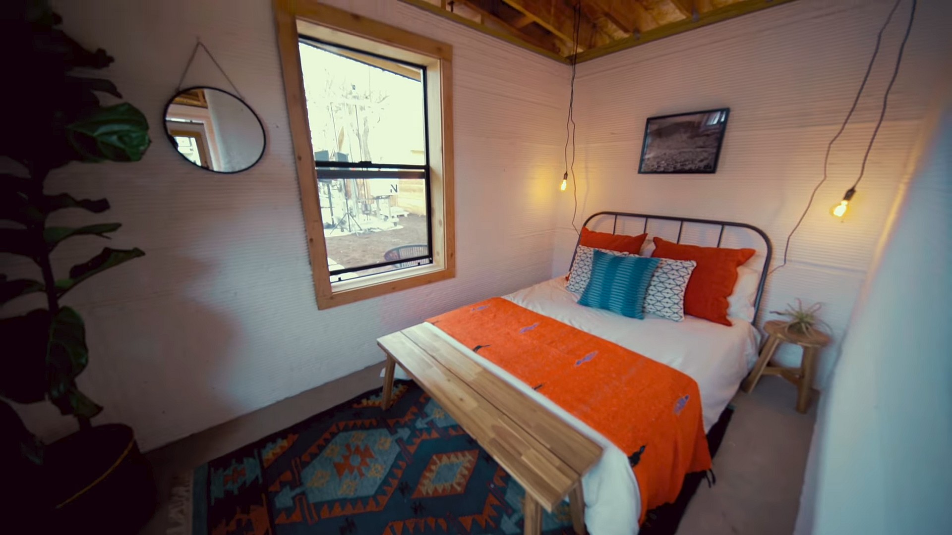 Each home is constructed out of concrete and is comprised of a living room, bedroom, bathroom, and a curved porch.