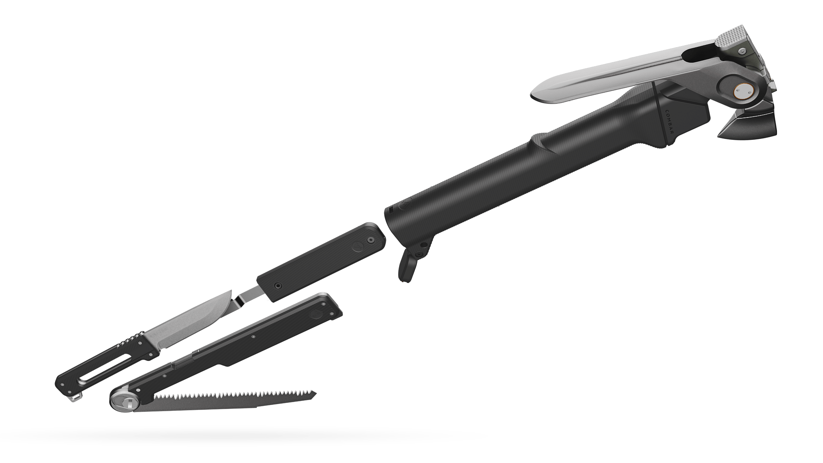 Designed by Yaniv Bar and Udi Cohen, two former Israeli Defense Forces special forces veterans, and made to military-spec standards, the 3.5-pound beast of a multitool contains a 2.25-inch axe, a 7-inch spade/pick, a 1.2-inch hammer pad, a 4.5-inch drop point knife, and a 9.5-inch saw. A set of unique locking mechanisms keep everything in place and all sharp edges tucked away.