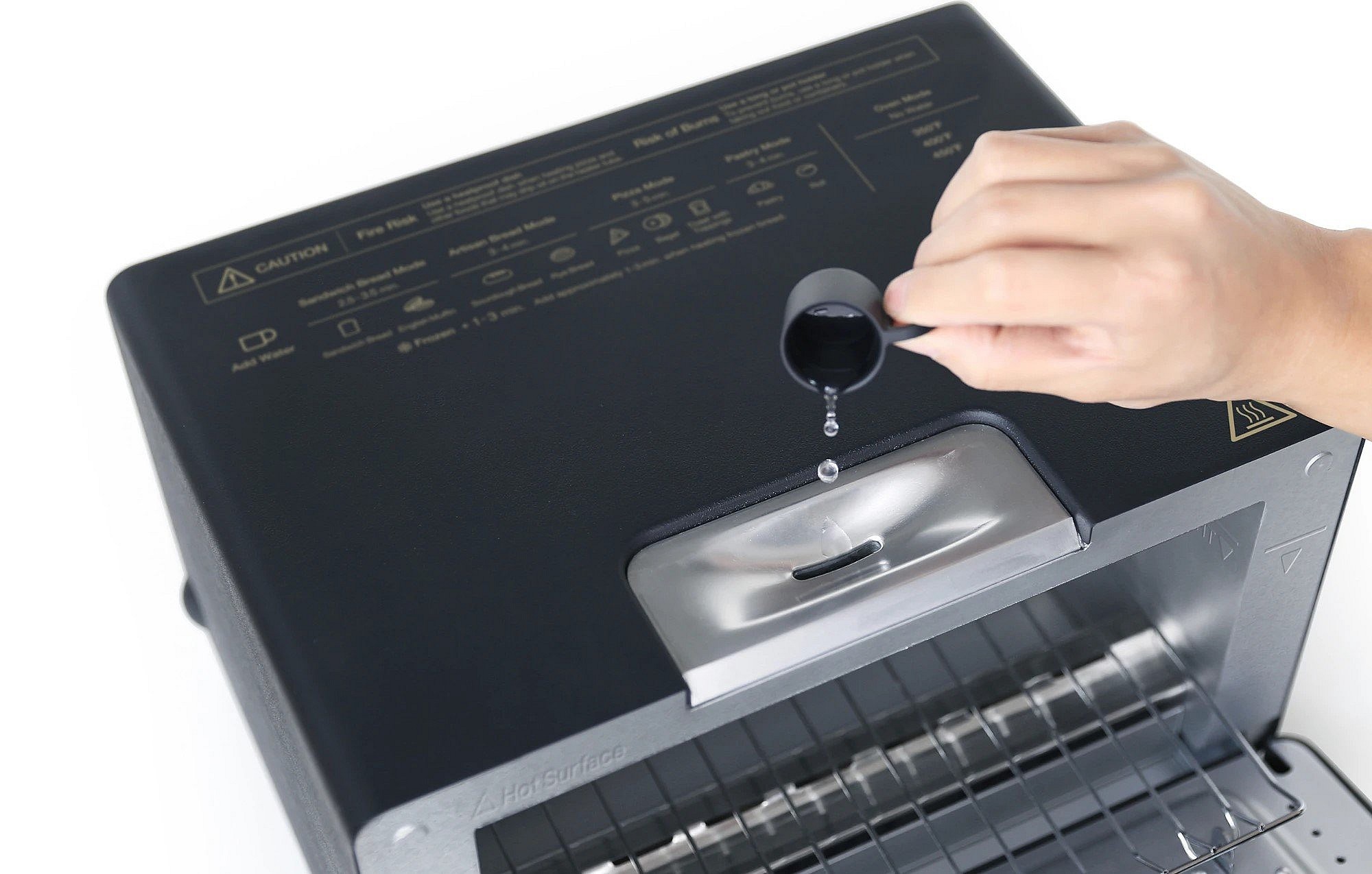 The company’s minimalist stunner, known simply as “The Toaster,” uses 5cc of water, which is poured into a top-mounted reservoir. In conjunction with three precisely controlled temperature zones, the water heats the air rapidly and lightly steams the bread, trapping inner moisture and flavor.