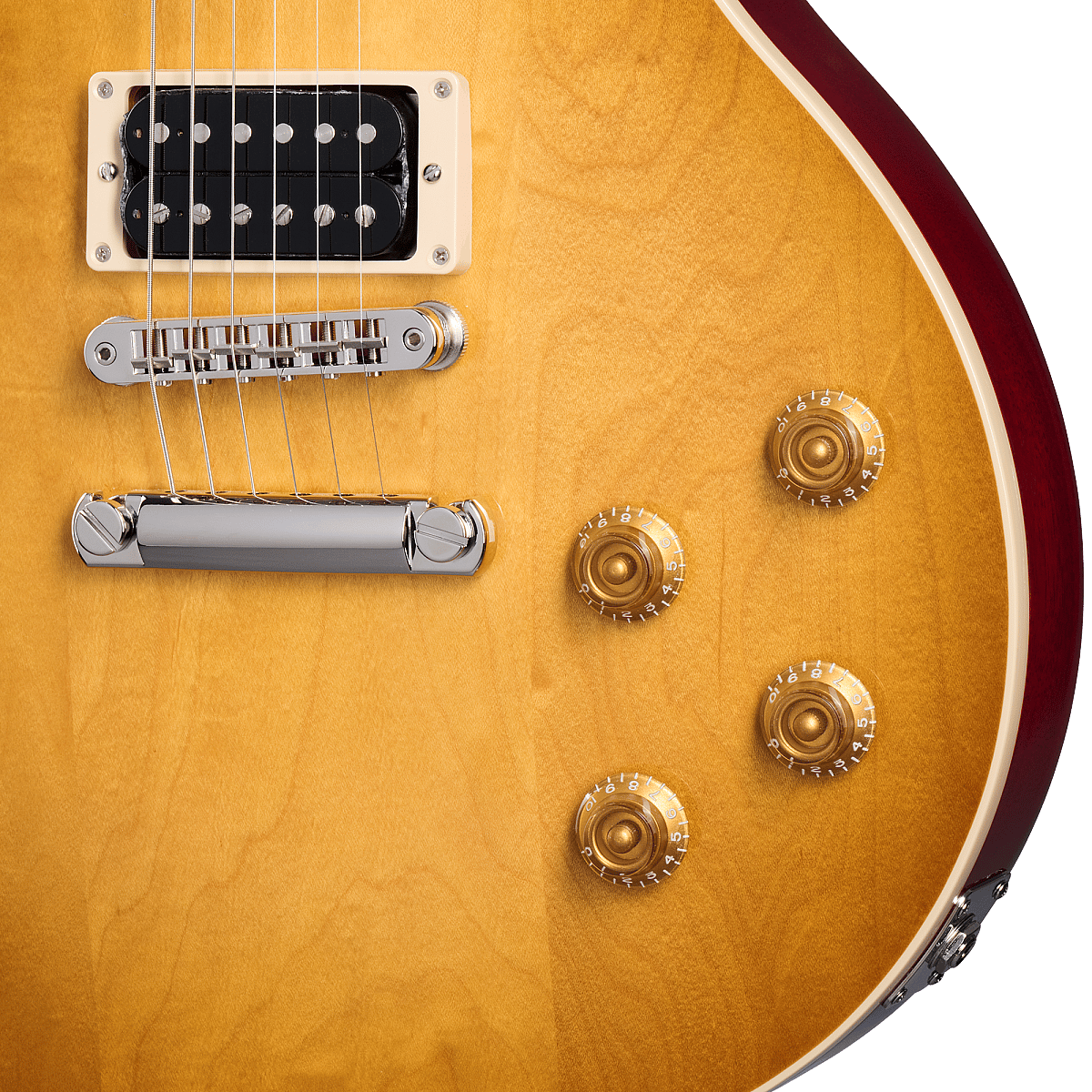 A Honey Burst finish with a red back nods to the refinishing process Slash used for his original “Jessica” model, while his signature sits on the truss rod cover. Slash’s “Skully” logo also adorns the rear of the headstock. Gibson also notes that Schaller strap locks come pre-installed on the handsome, hard-rocking piece.