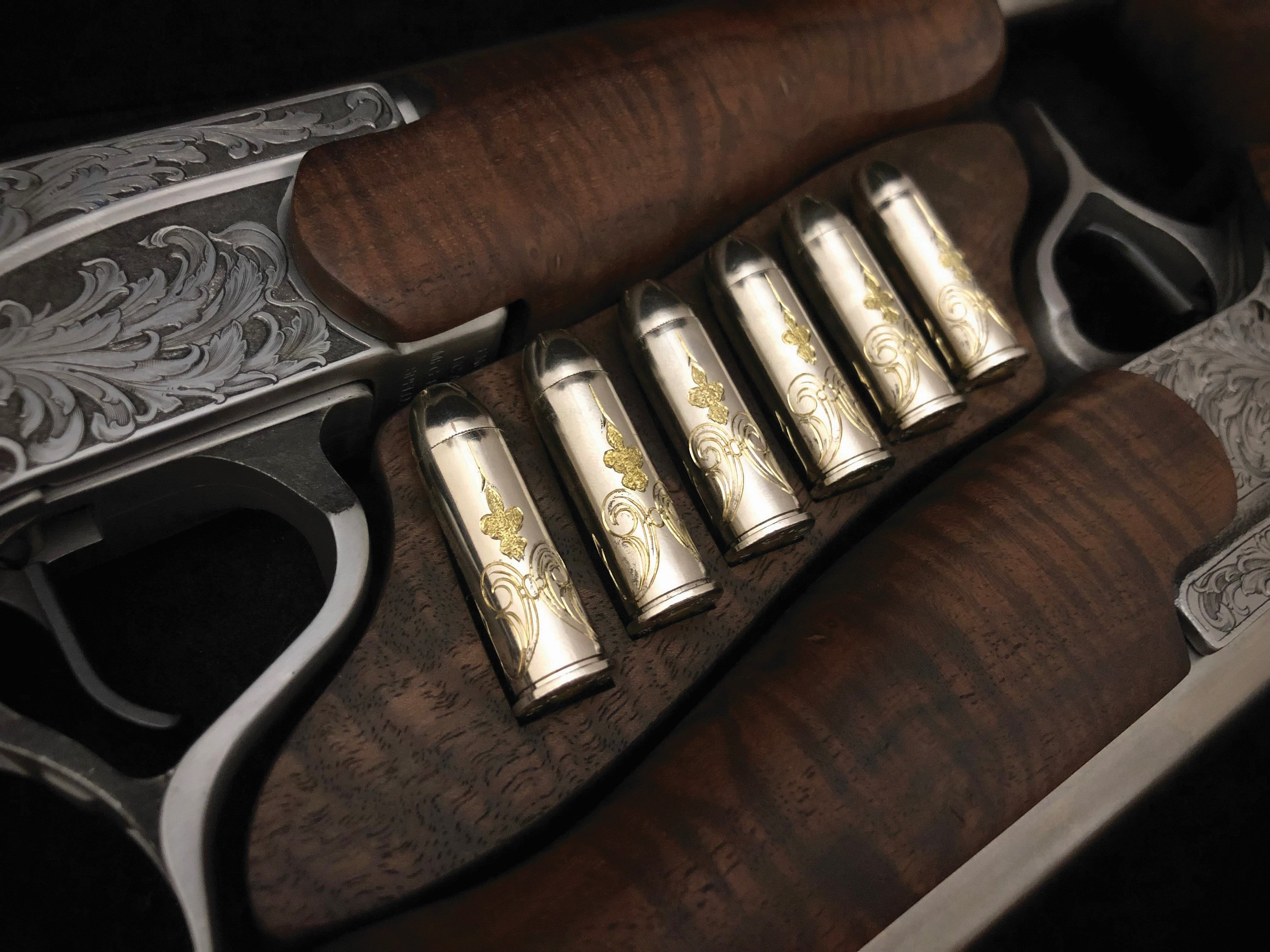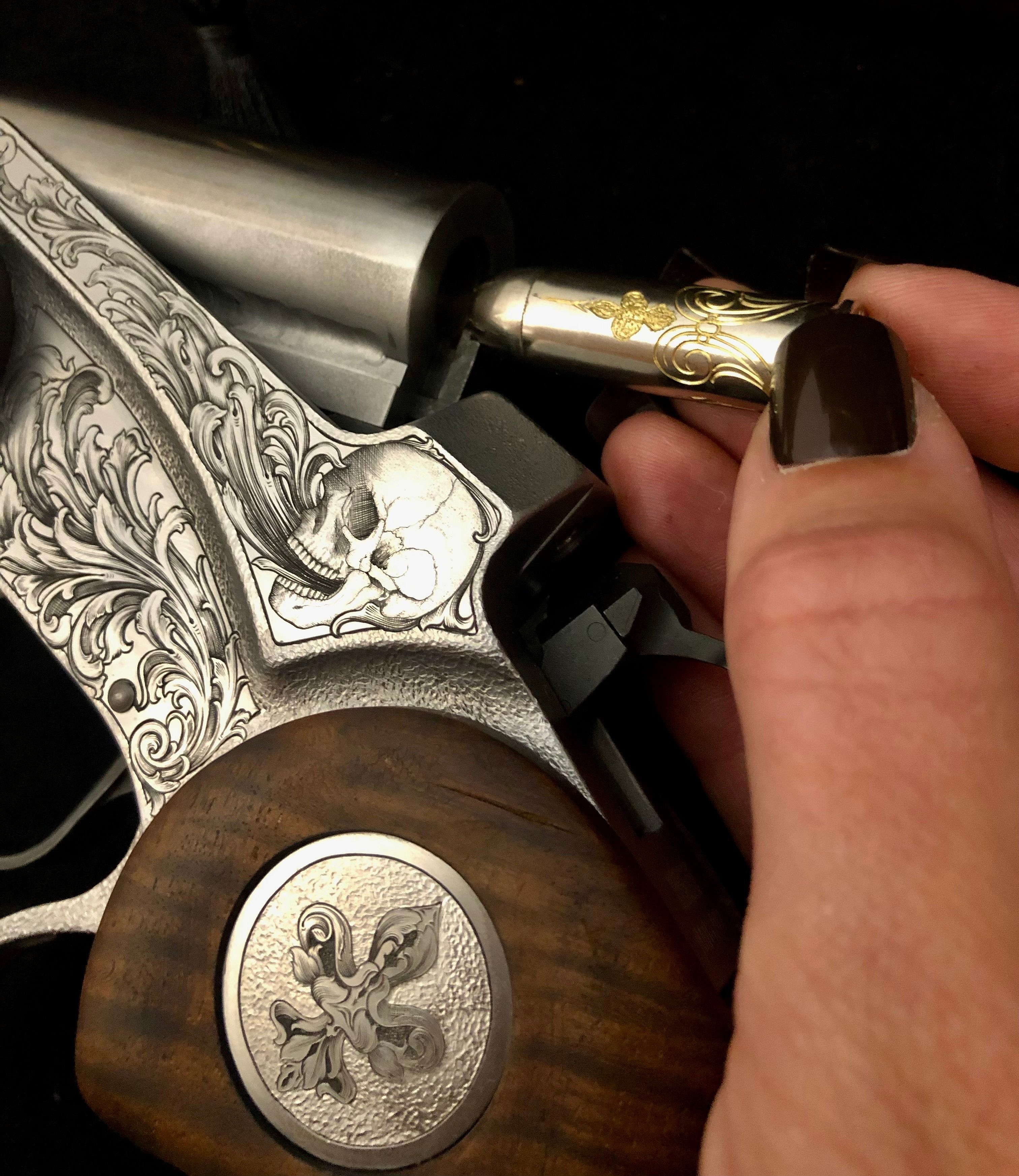 “At this point, I thought I was done and the project was coming to a finish, but then came Rock’s idea for engraving the round [shell] casings… and lots of them,” she says. “Each of those has my simple scrolling and a silhouette of the specific fleur-de-lis detail I designed for the grip medallions.”