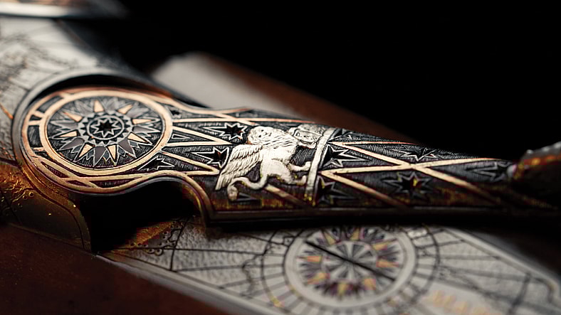 The Marco Polo shotgun, built on the brand’s SO6 EELL Sparviere 12-gauge over-and-under platform, required 1,500 hours of hand-engraving and another 500 hours of work by master gunsmiths, stock and gun-case makers. The design features sailing and exploration themes, with copper-inlaid compass roses, diamond and star patterns, and engravings depicting Marco Polo’s journeys from Venice to the Mongolian steppes. The handmade gun case is finished in bright yellow leather with a print of a medieval map of the known world at the time of its namesake’s explorations, complete with blue leather details on the edges and handle and an interior of Venetian red silk.