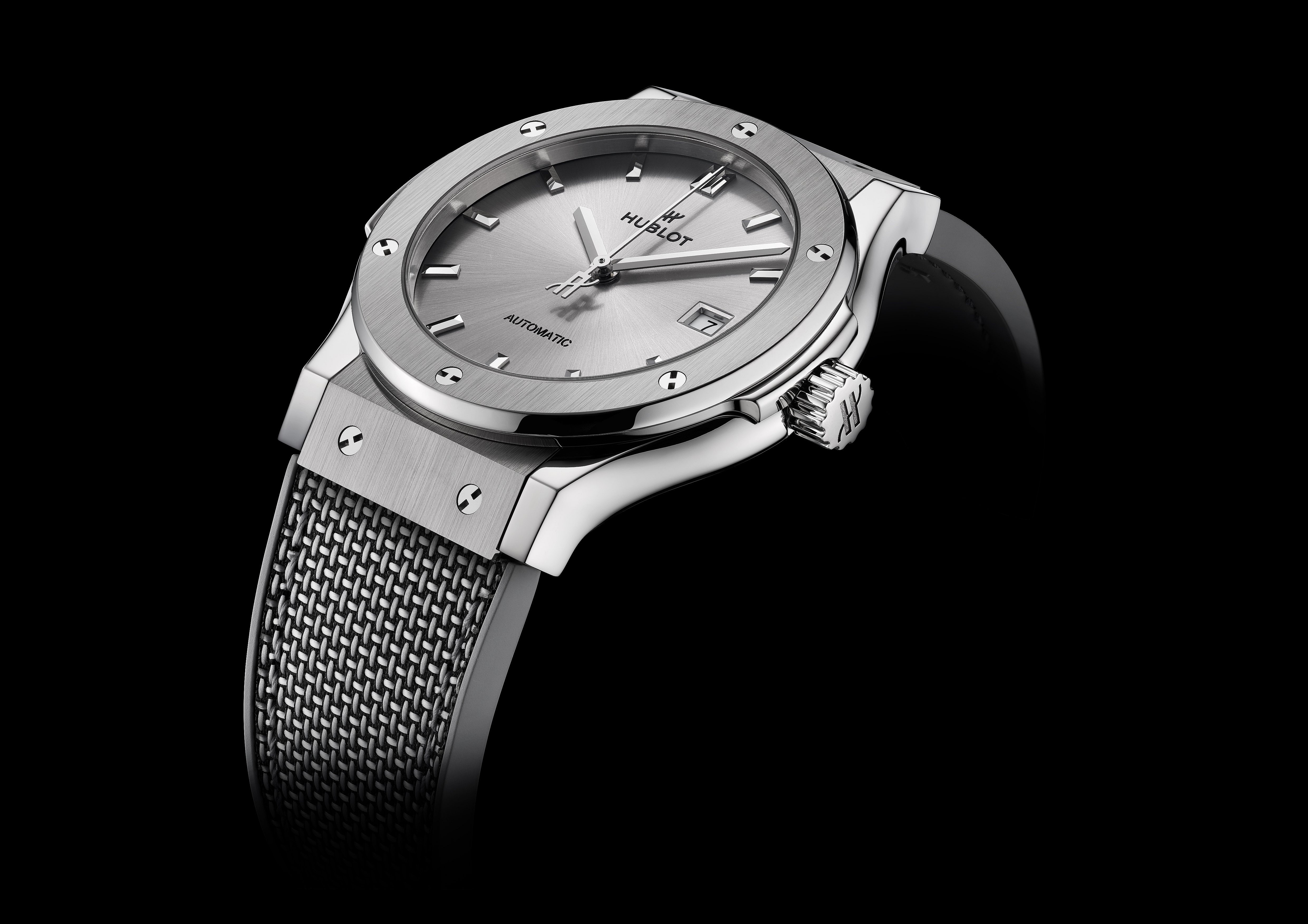 The pared-down design features a satin-finished titanium case, a titanium bezel clamped down by six of Hublot’s hallmark H-shaped screws, a sunray-finished dial with three central hands and an unassuming date window, and an integrated bracelet or a textured rubber strap.