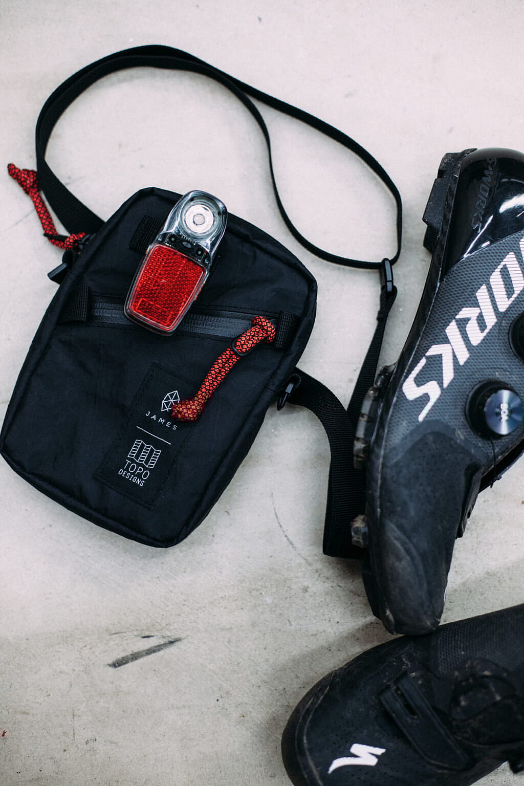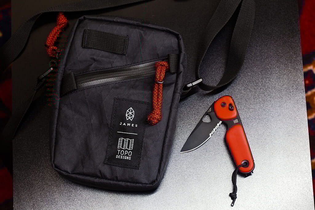 A webbing shoulder strap, secured by strong clips, makes it easy to tote this bag, and we could even see the front zipper pocket acting as a useful storage space for the Topo Designs x James Brand knife itself.