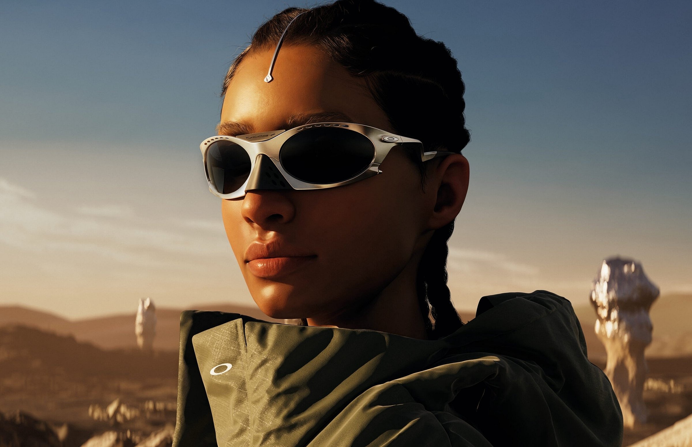 The sporty shadesmaker is pausing from heralding rapper Travis Scott as the company’s “Chief Visionary” and hyping Meta-branded AI glasses with the help of Patrick Mahomes to drop a flashy, sci-fi-inspired design that channels last year’s Moonveil collection and the metal and leather MUZM Mars shades.