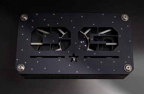 A special key is required to remove the star-flecked outer cover, while custom fasteners were created to resemble lunar modules and mimic those that secure space cargo.