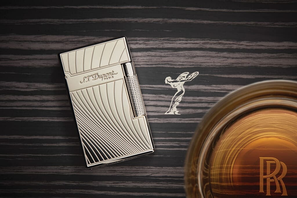 The hinged lid and sides deploy to reveal an Obsidian Ayous Open Pore veneer serving tray with a Spirit of Ecstasy inlay; a set of hand-blown rocks glasses bearing the iconic ‘RR’ monogram, which rotate outwards as the Cellarette opens; an armagnac leather-lined bottle pannier, adaptable to different bottle sizes, held in place with a magnetized, polished-aluminum fastener; a Spanish Cedarwood-lined humidor, complete with hygrometer designed to evoke the hands of the fabled dashboard Rolls-Royce clock; a beautifully-made cigar tray; and a custom cigar cutter and lighter, made by S.T. Dupont of Paris, and engraved with the Spirit of Ecstasy, all bathed in the soft glow of ambient lighting.