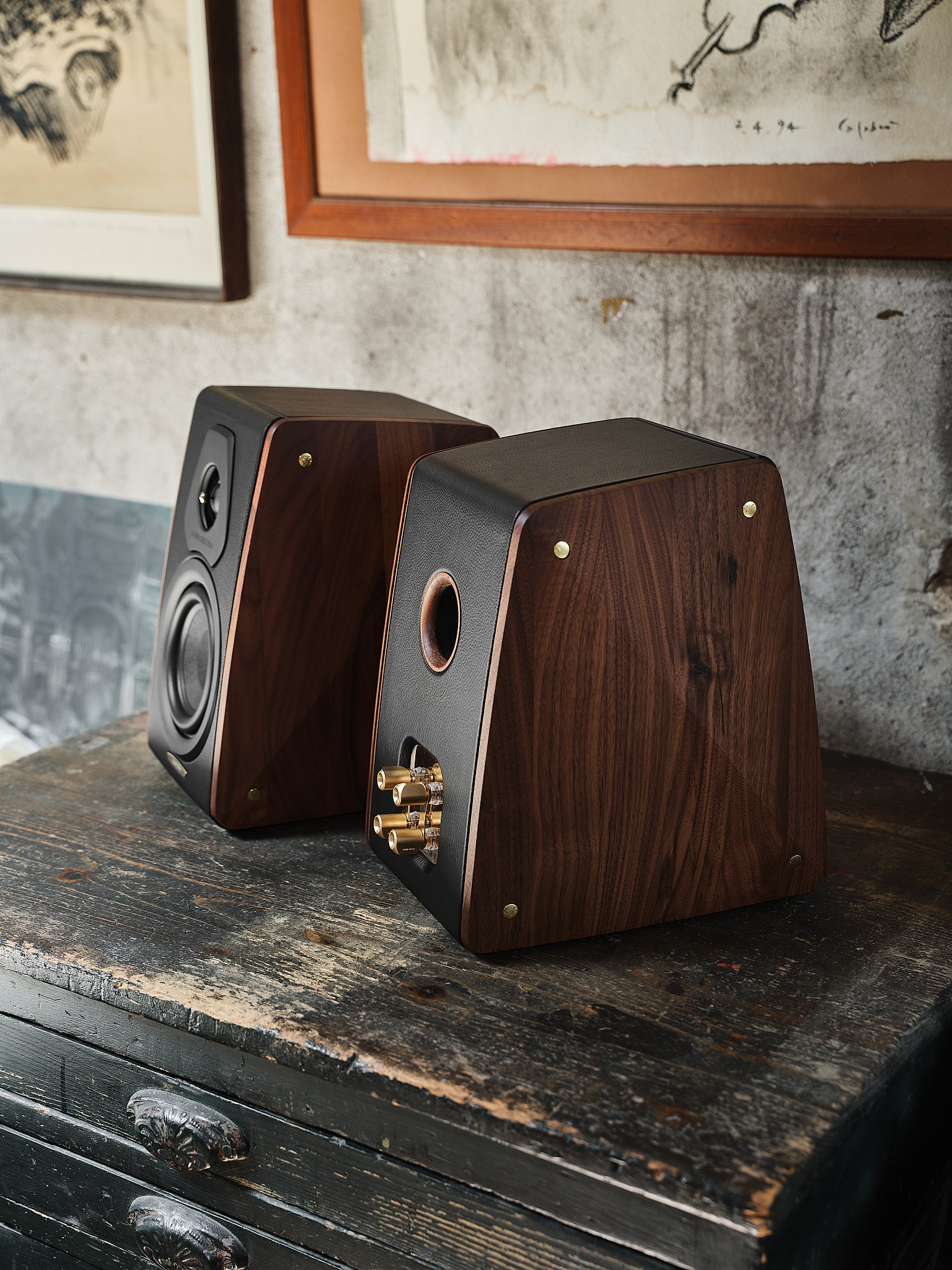 As a part of the Heritage collection, the Concertino G4 is an update of a trapezoidal design penned in the first 15 years of Sonus faber, which was founded in 1983. It’s a two-way speaker featuring a 1-inch silk dome tweeter, a 5-inch midwoofer, and a reflex duct positioned at the back of the cabinet. But Sonus faber has long favored the use of natural materials in its products—even the very earliest prototypes featured natural wood cabinets.