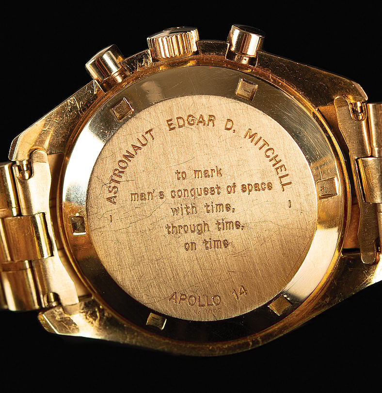 The back of Mitchell’s timepiece is engraved: “Astronaut Edgar D. Mitchell, Apollo 14,” and features the same exclusive astronaut-only quote. The watch comes with a letter of authenticity from his daughter, Karlyn Mitchell.